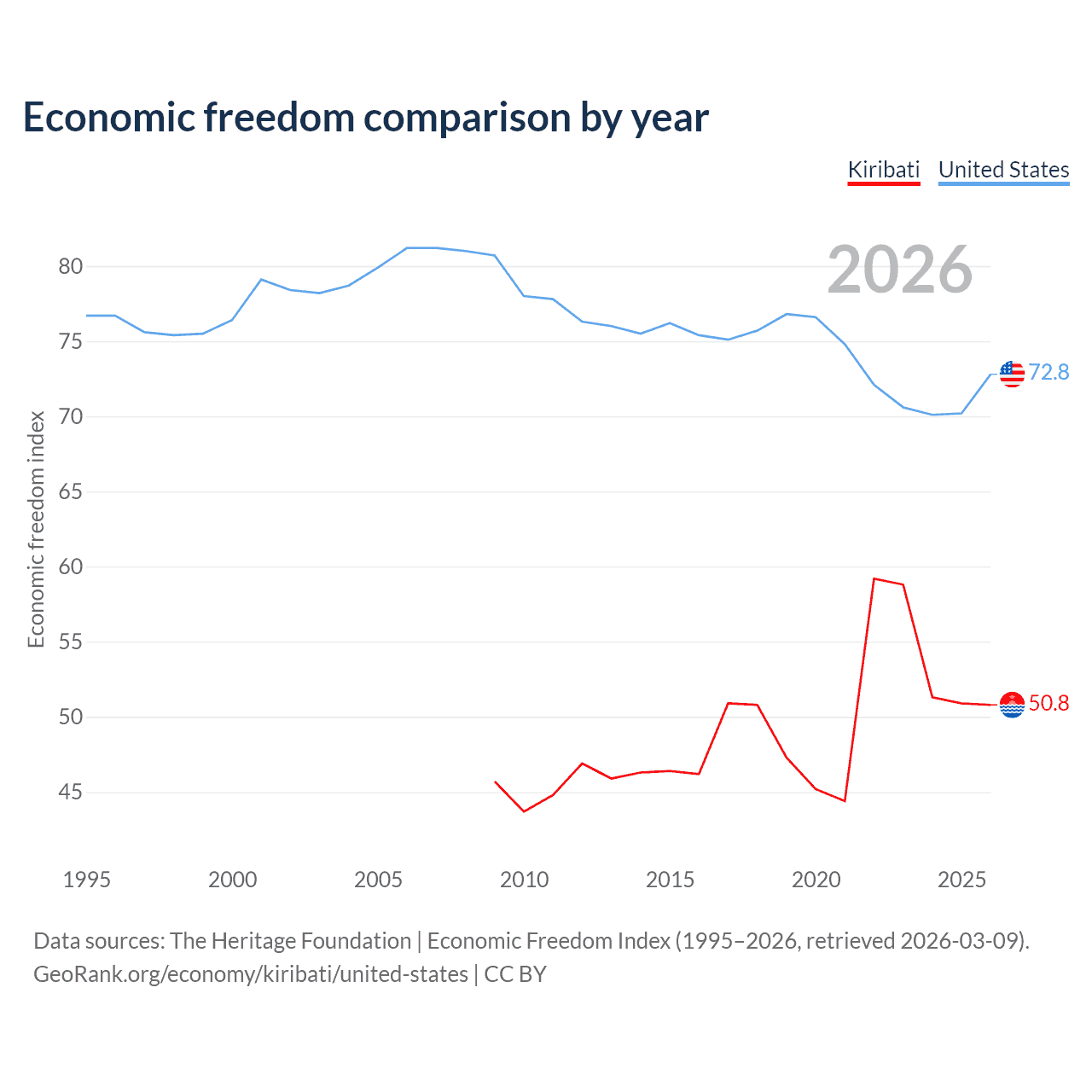 The Economic Freedom Index for Kiribati is 50.8, ranking 158/197, compared to 72.8 for the United States, ranking 27/197. The chart above displays a comparison of annual changes in economic freedom indexes.