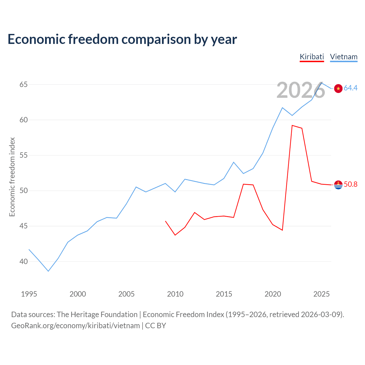 The Economic Freedom Index for Kiribati is 50.8, ranking 158/197, compared to 64.4 for Vietnam, ranking 73/197. The chart above displays a comparison of annual changes in economic freedom indexes.