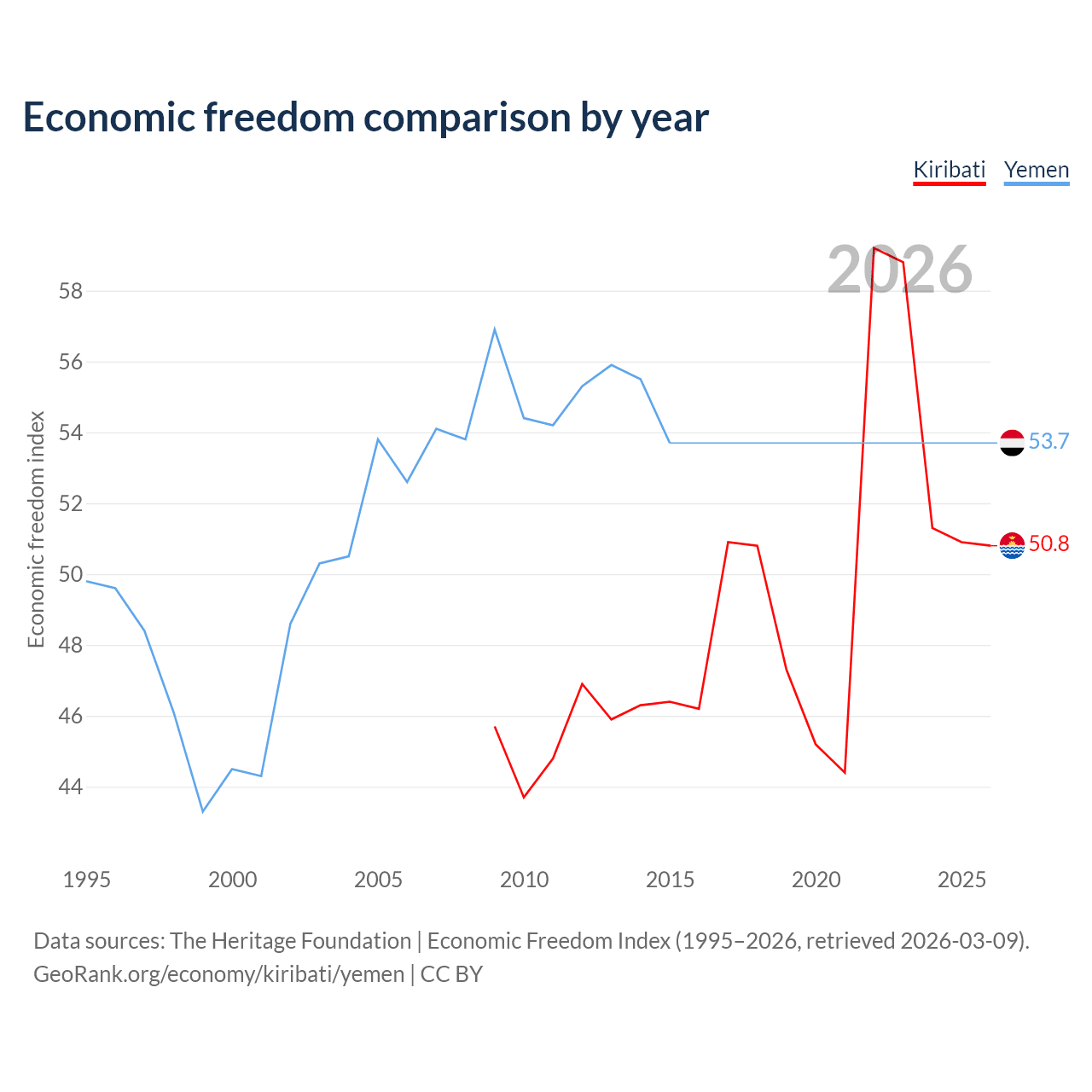 The Economic Freedom Index for Kiribati is 50.8, ranking 158/197, compared to 53.7 for Yemen, ranking 138/197. The chart above displays a comparison of annual changes in economic freedom indexes.