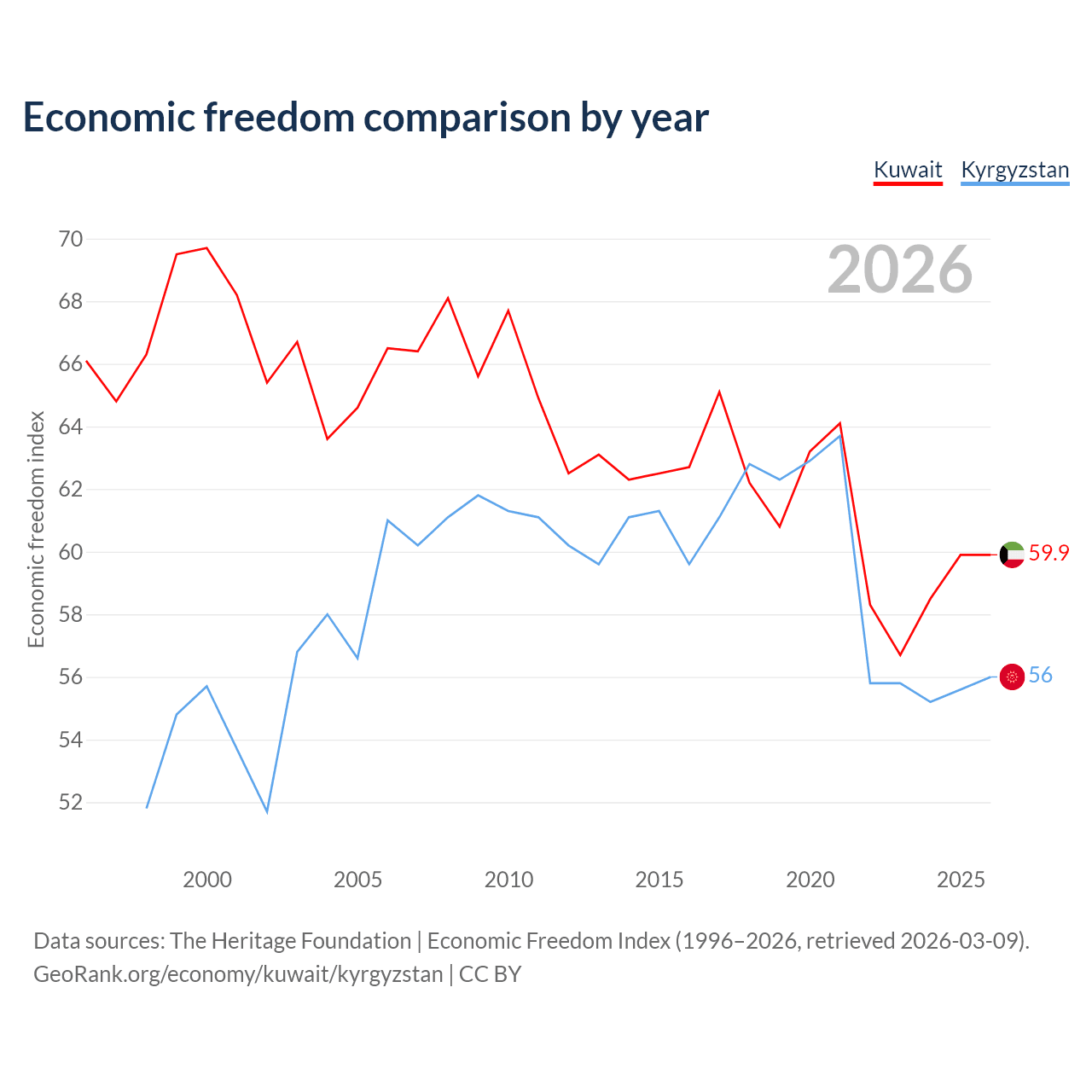 The Economic Freedom Index for Kuwait is 59.9, ranking 100/197, compared to 56 for Kyrgyzstan, ranking 126/197. The chart above displays a comparison of annual changes in economic freedom indexes.