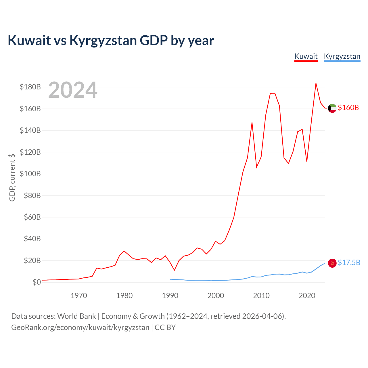 Kuwait has a GDP of $160B compared to $17.5B for Kyrgyzstan, ranking 59/197 and 135/197 by economy size, respectively.