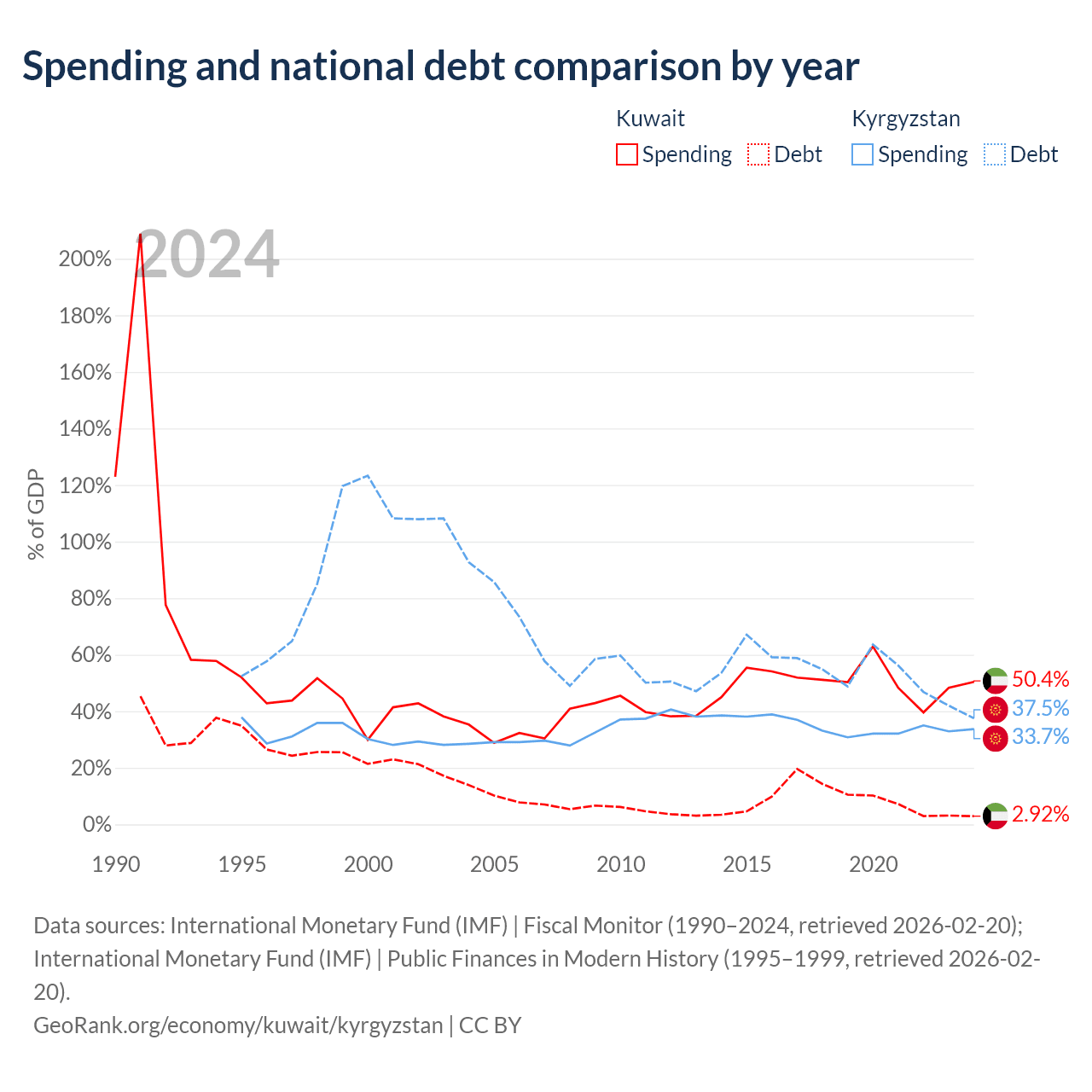 Kuwait has $4.68B in government debt (2.92% of GDP), compared to $6.56B (37.5% of GDP) in Kyrgyzstan.