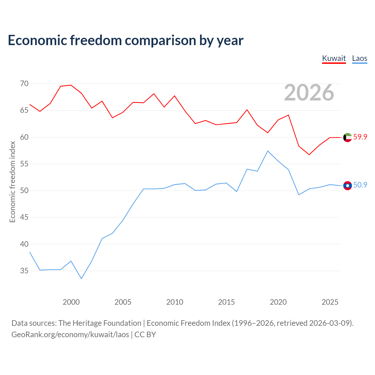 The Economic Freedom Index for Kuwait is 59.9, ranking 100/197, compared to 50.9 for Laos, ranking 157/197. The chart above displays a comparison of annual changes in economic freedom indexes.