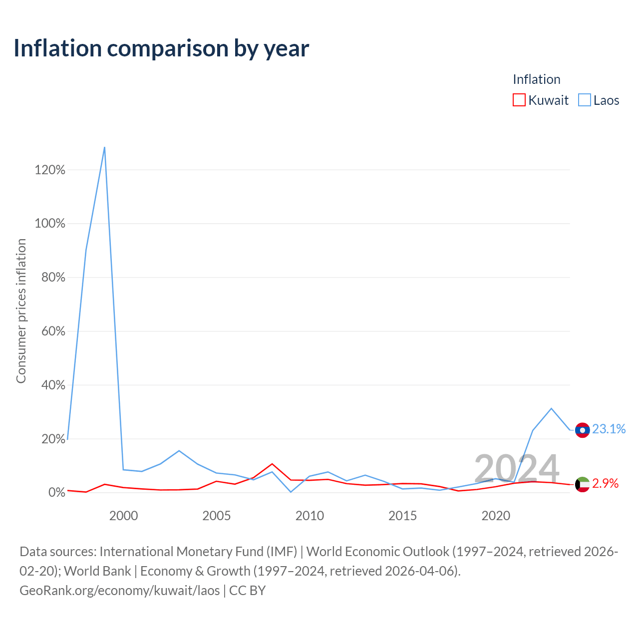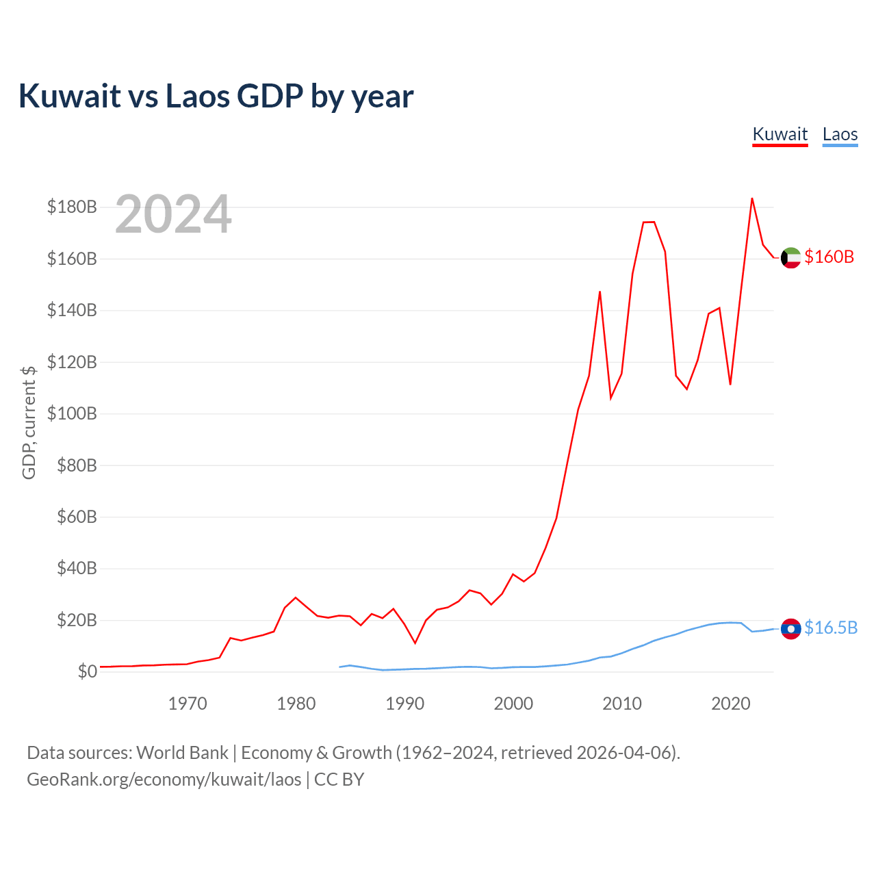 Kuwait has a GDP of $160B compared to $16.5B for Laos, ranking 59/197 and 139/197 by economy size, respectively.