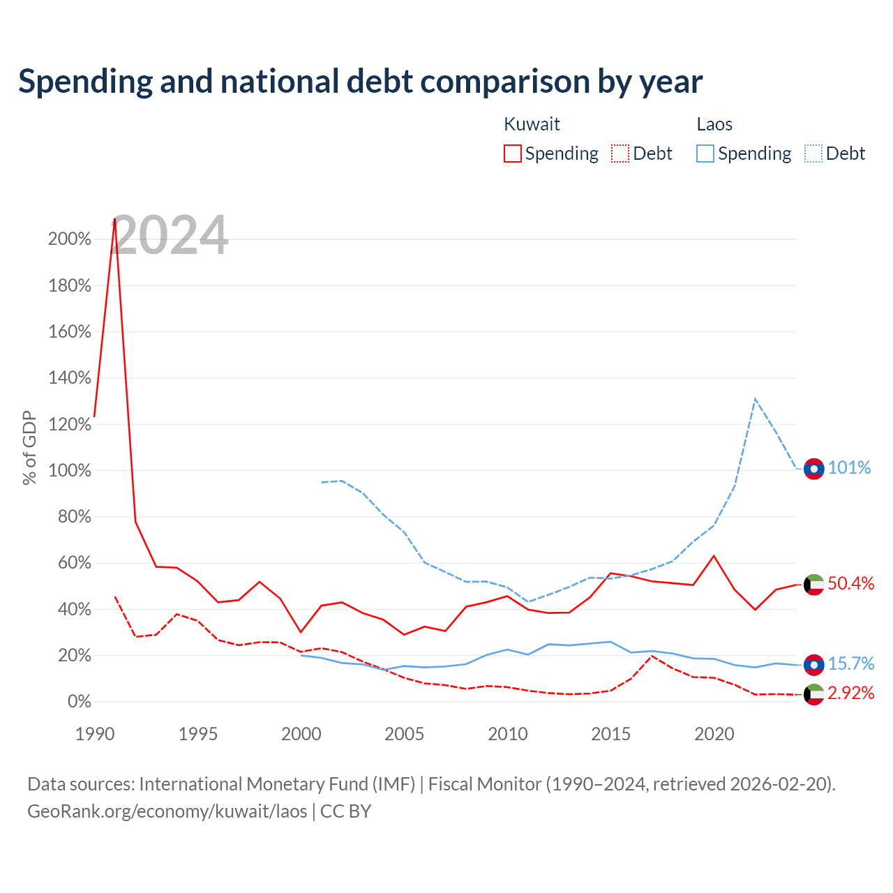 Kuwait has $4.68B in government debt (2.92% of GDP), compared to $16.6B (100.5% of GDP) in Laos.