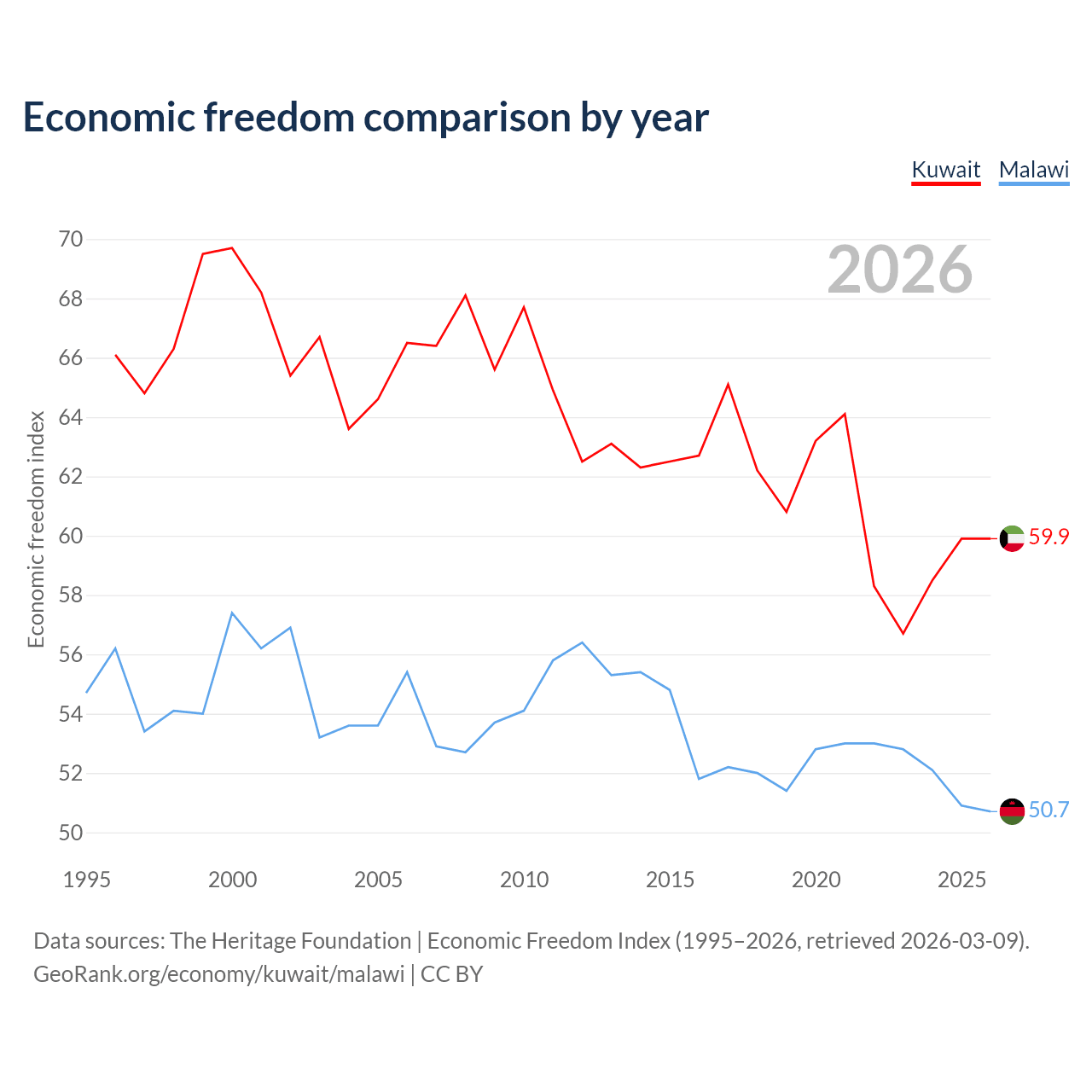 The Economic Freedom Index for Kuwait is 59.9, ranking 100/197, compared to 50.7 for Malawi, ranking 159/197. The chart above displays a comparison of annual changes in economic freedom indexes.