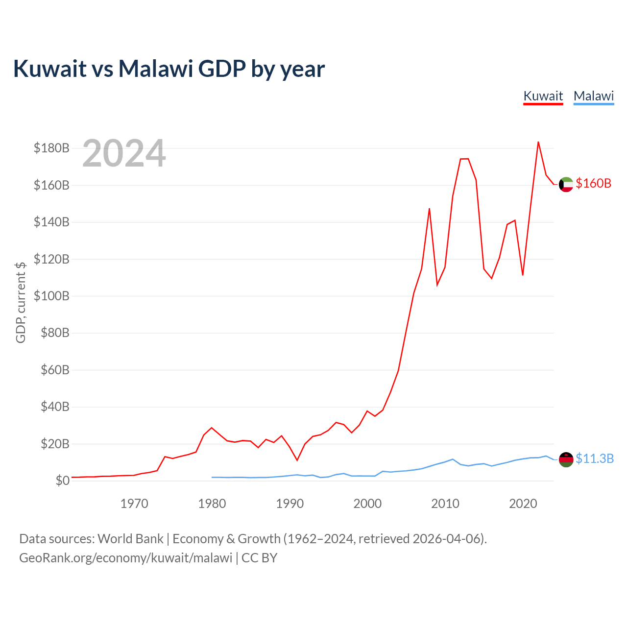Kuwait has a GDP of $160B compared to $11.3B for Malawi, ranking 59/197 and 151/197 by economy size, respectively.