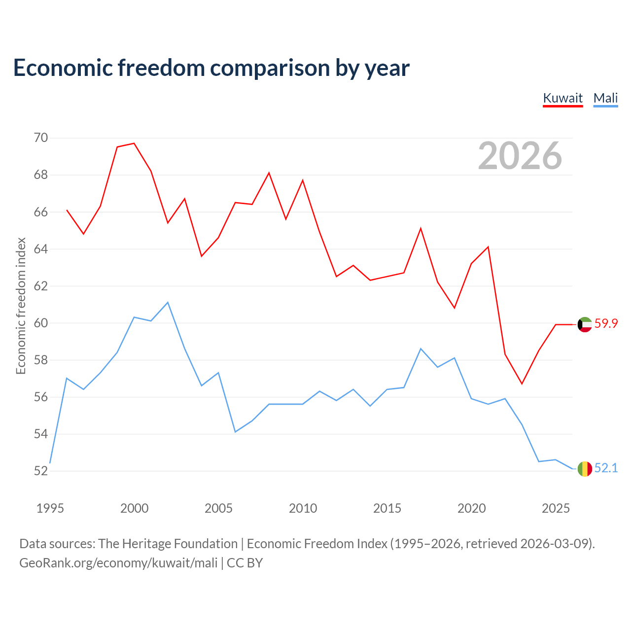 The Economic Freedom Index for Kuwait is 59.9, ranking 100/197, compared to 52.1 for Mali, ranking 150/197. The chart above displays a comparison of annual changes in economic freedom indexes.