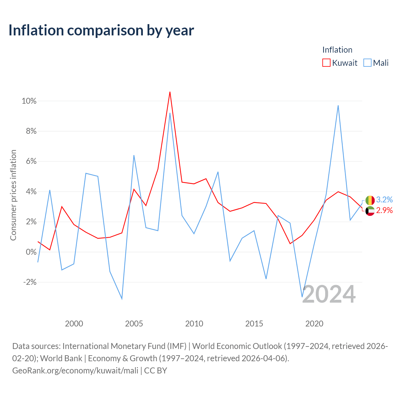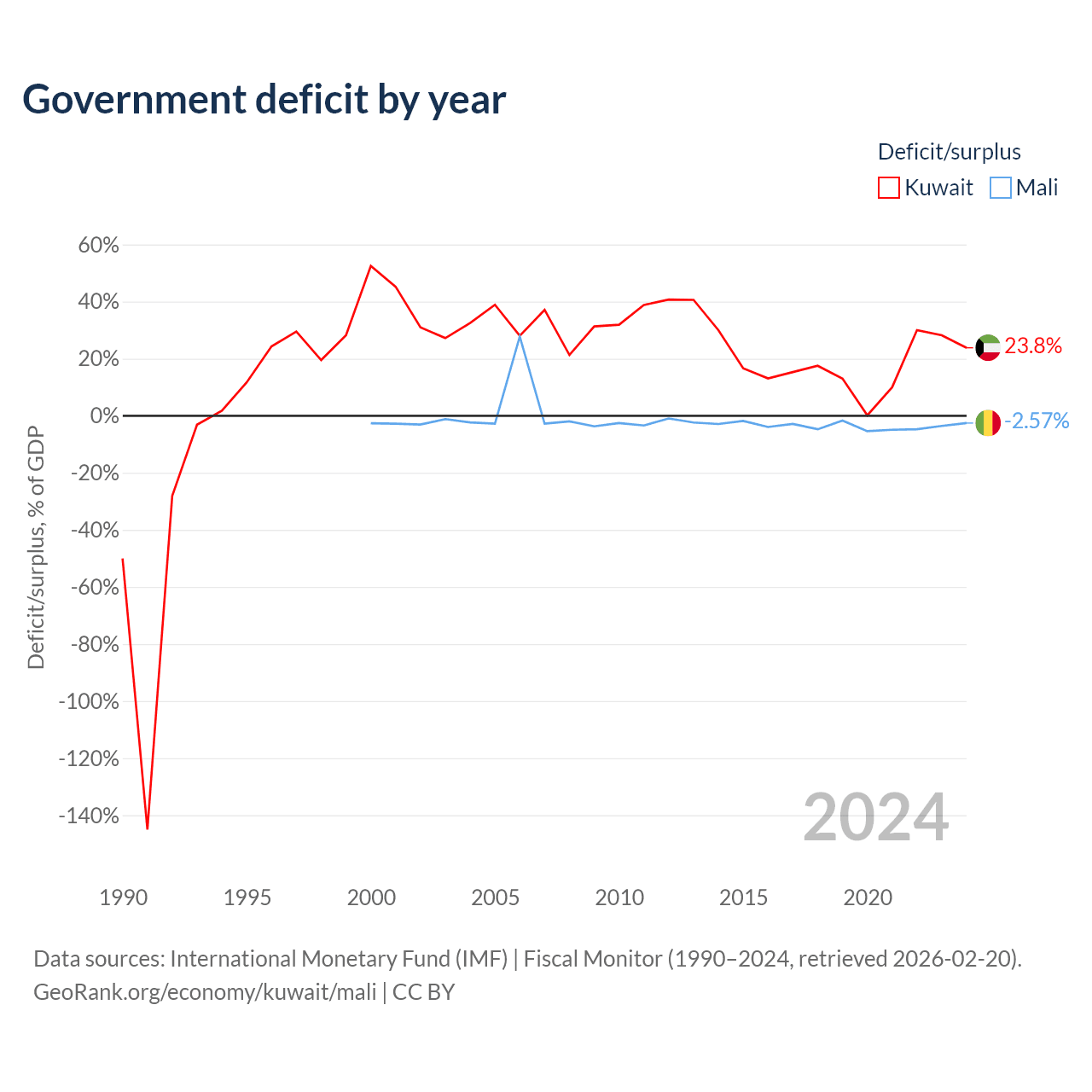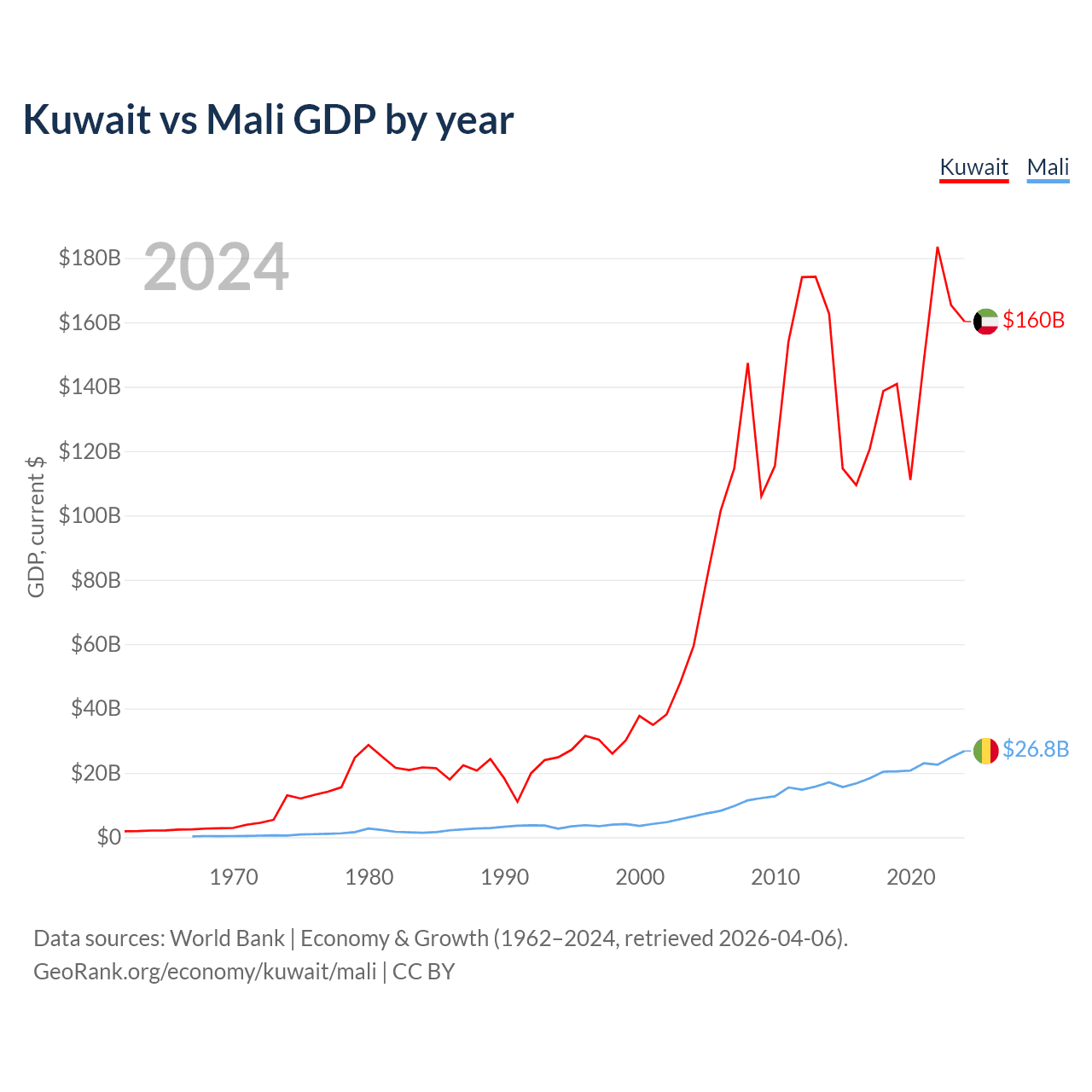 Kuwait has a GDP of $160B compared to $26.8B for Mali, ranking 59/197 and 113/197 by economy size, respectively.