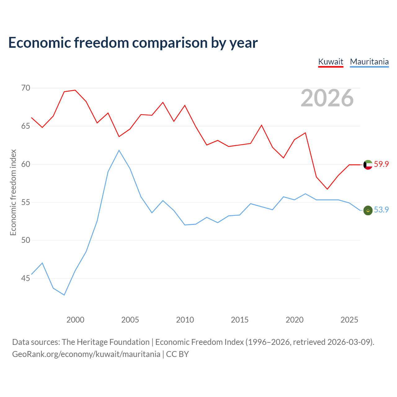 The Economic Freedom Index for Kuwait is 59.9, ranking 100/197, compared to 53.9 for Mauritania, ranking 136/197. The chart above displays a comparison of annual changes in economic freedom indexes.