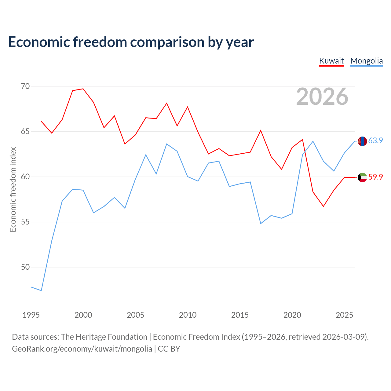 The Economic Freedom Index for Kuwait is 59.9, ranking 100/197, compared to 63.9 for Mongolia, ranking 76/197. The chart above displays a comparison of annual changes in economic freedom indexes.