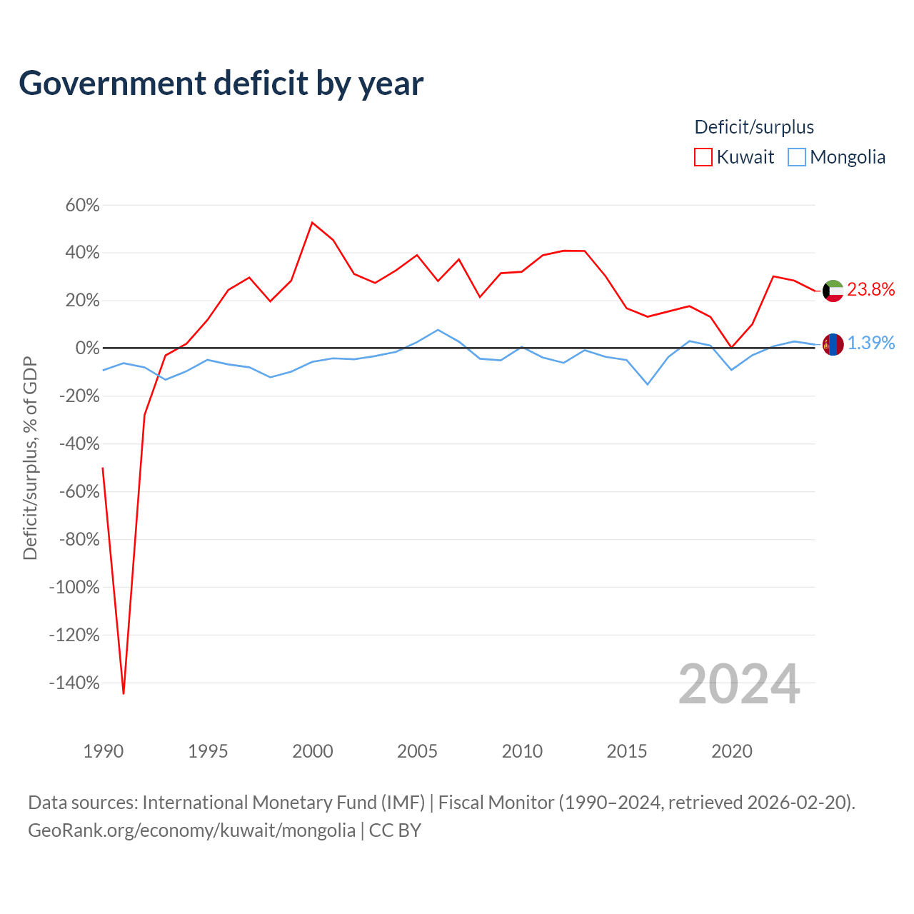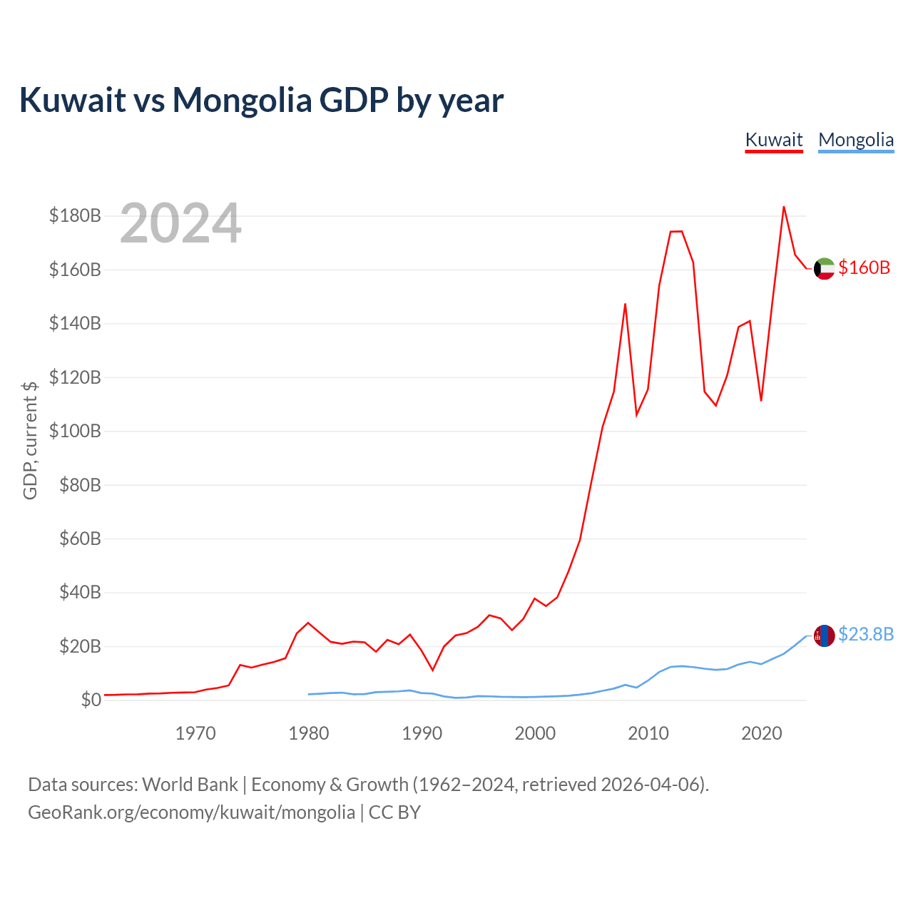Kuwait has a GDP of $160B compared to $23.8B for Mongolia, ranking 59/197 and 121/197 by economy size, respectively.