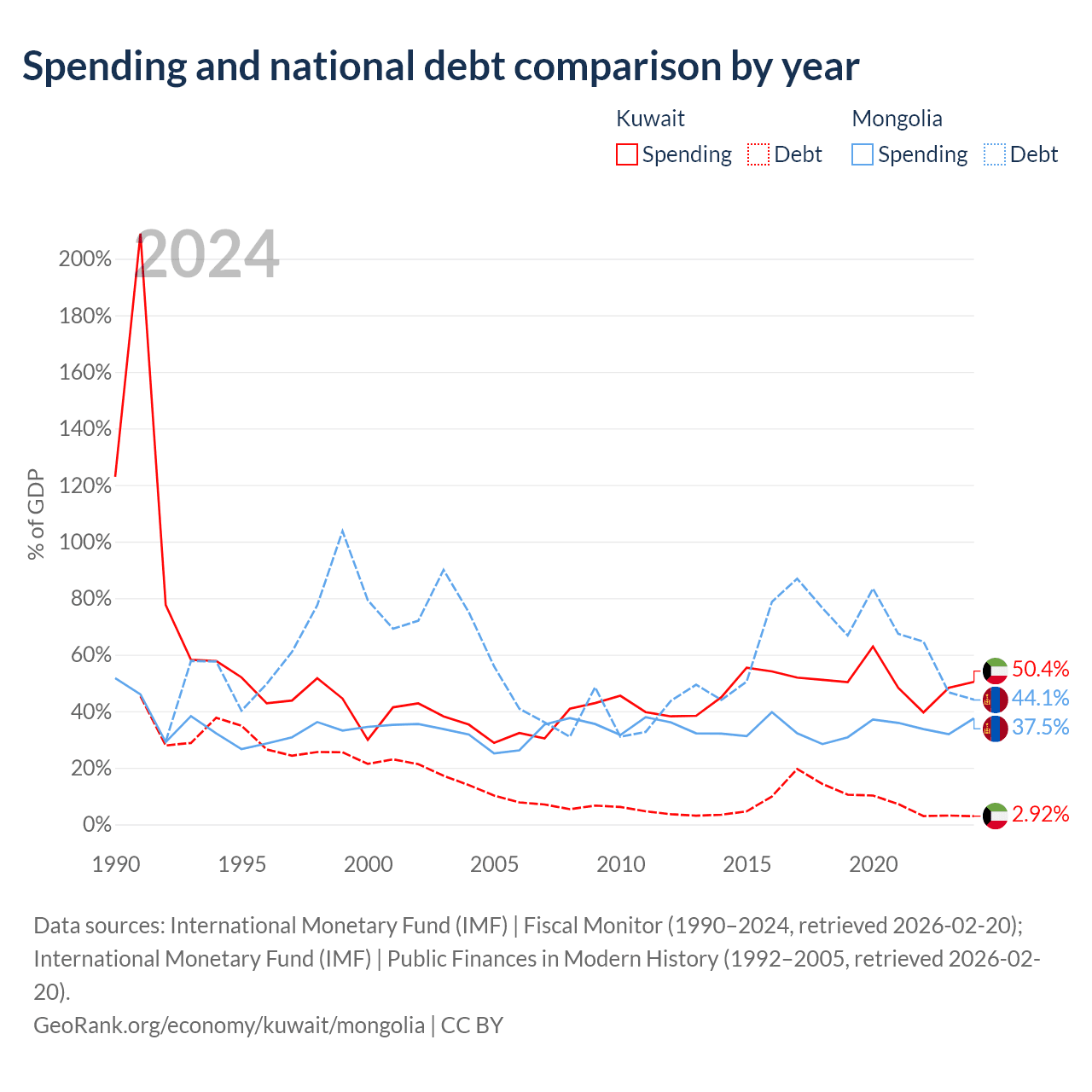 Kuwait has $4.68B in government debt (2.92% of GDP), compared to $10.5B (44.1% of GDP) in Mongolia.