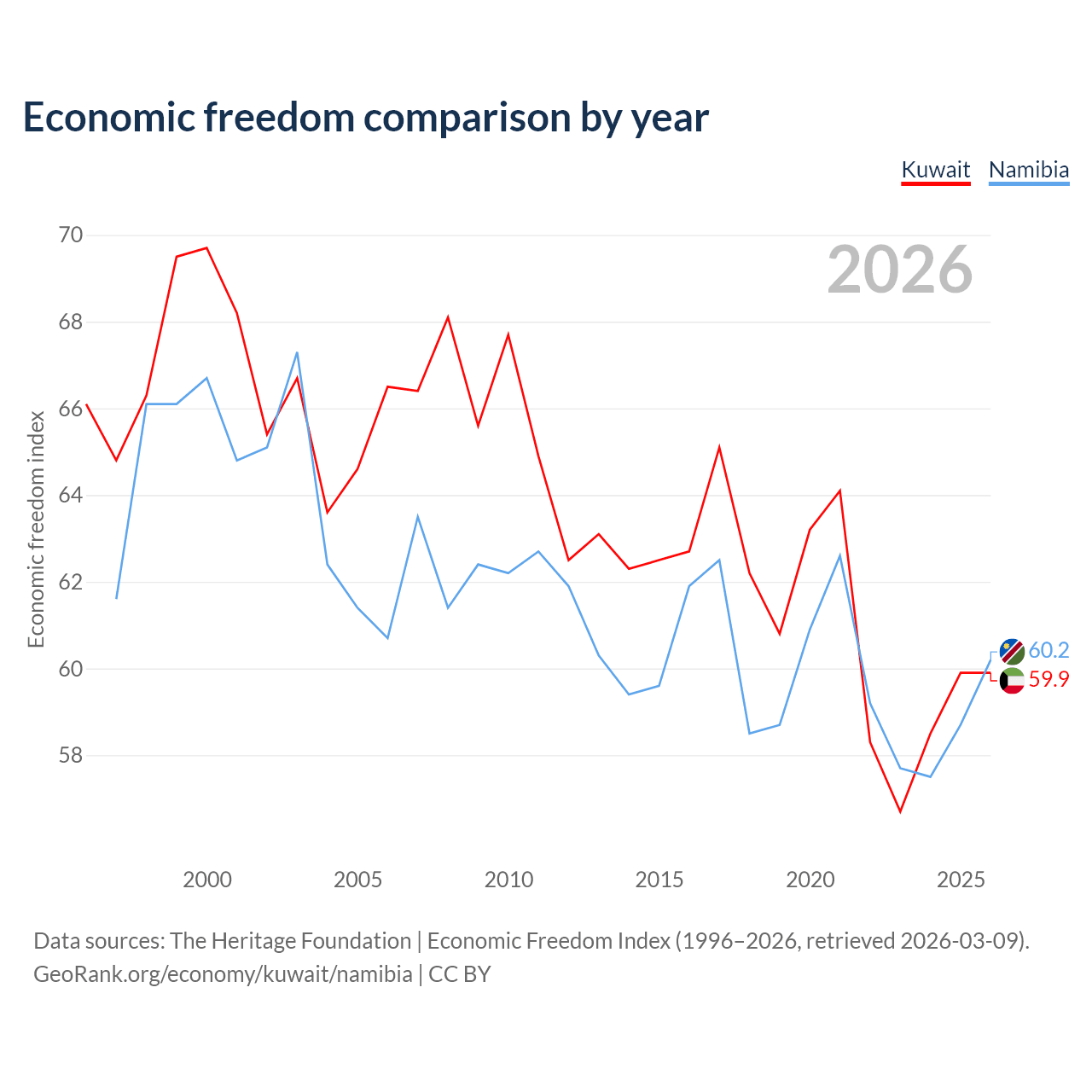 The Economic Freedom Index for Kuwait is 59.9, ranking 100/197, compared to 60.2 for Namibia, ranking 95/197. The chart above displays a comparison of annual changes in economic freedom indexes.