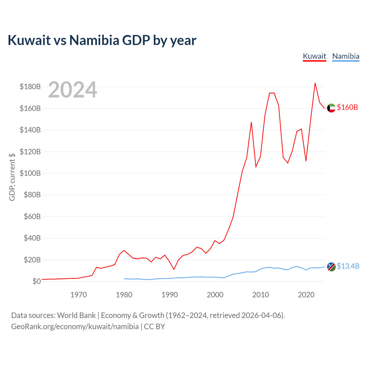 Kuwait has a GDP of $160B compared to $13.4B for Namibia, ranking 59/197 and 147/197 by economy size, respectively.