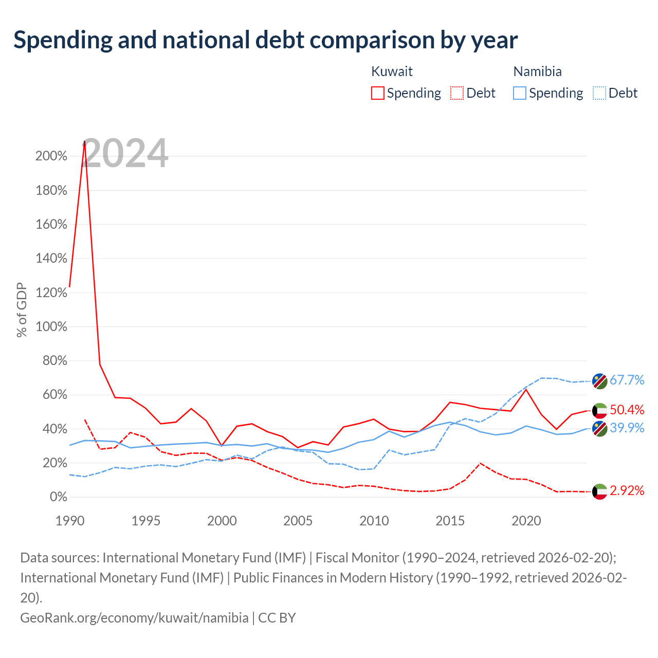 Kuwait has $4.68B in government debt (2.92% of GDP), compared to $9.05B (67.7% of GDP) in Namibia.