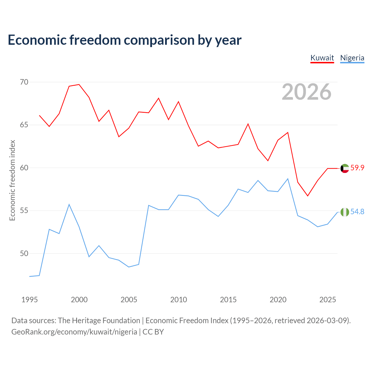 The Economic Freedom Index for Kuwait is 59.9, ranking 100/197, compared to 54.8 for Nigeria, ranking 132/197. The chart above displays a comparison of annual changes in economic freedom indexes.