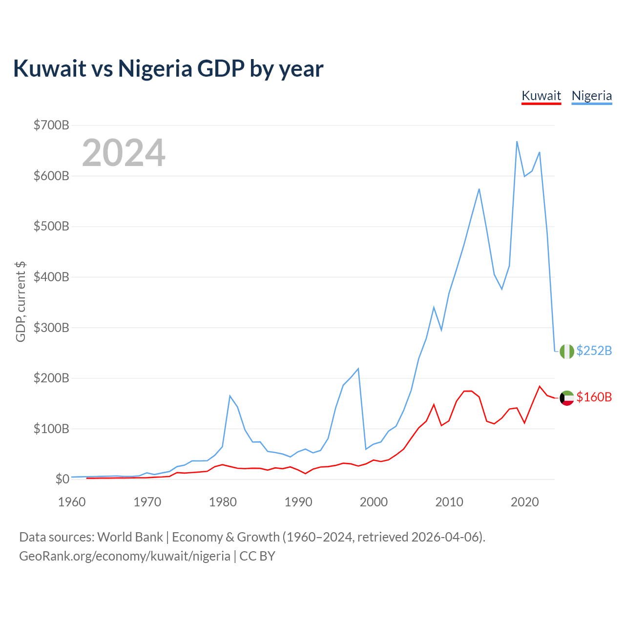 Kuwait has a GDP of $160B compared to $252B for Nigeria, ranking 59/197 and 54/197 by economy size, respectively.