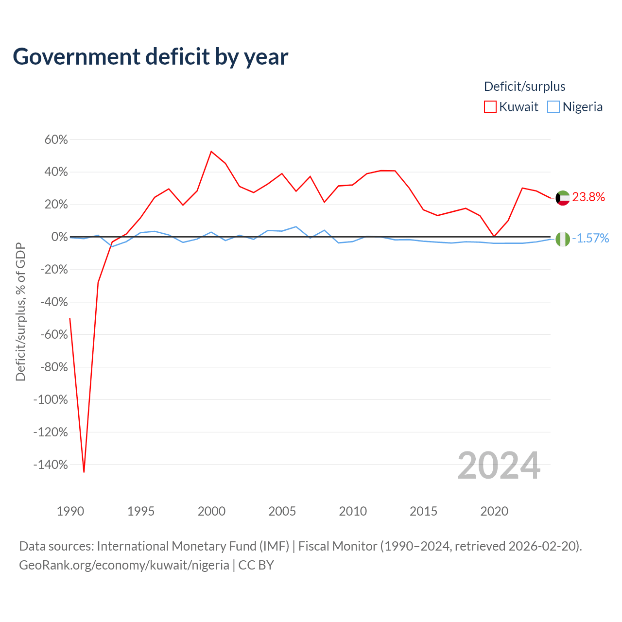 Kuwait has $4.68B in government debt (2.92% of GDP), compared to $99.2B (39.3% of GDP) in Nigeria.