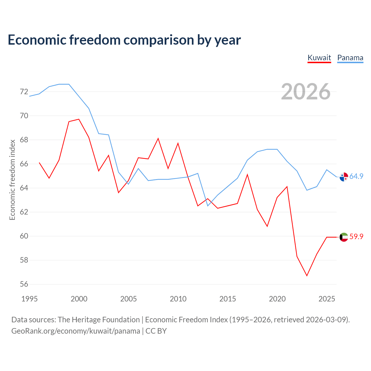 The Economic Freedom Index for Kuwait is 59.9, ranking 100/197, compared to 64.9 for Panama, ranking 70/197. The chart above displays a comparison of annual changes in economic freedom indexes.