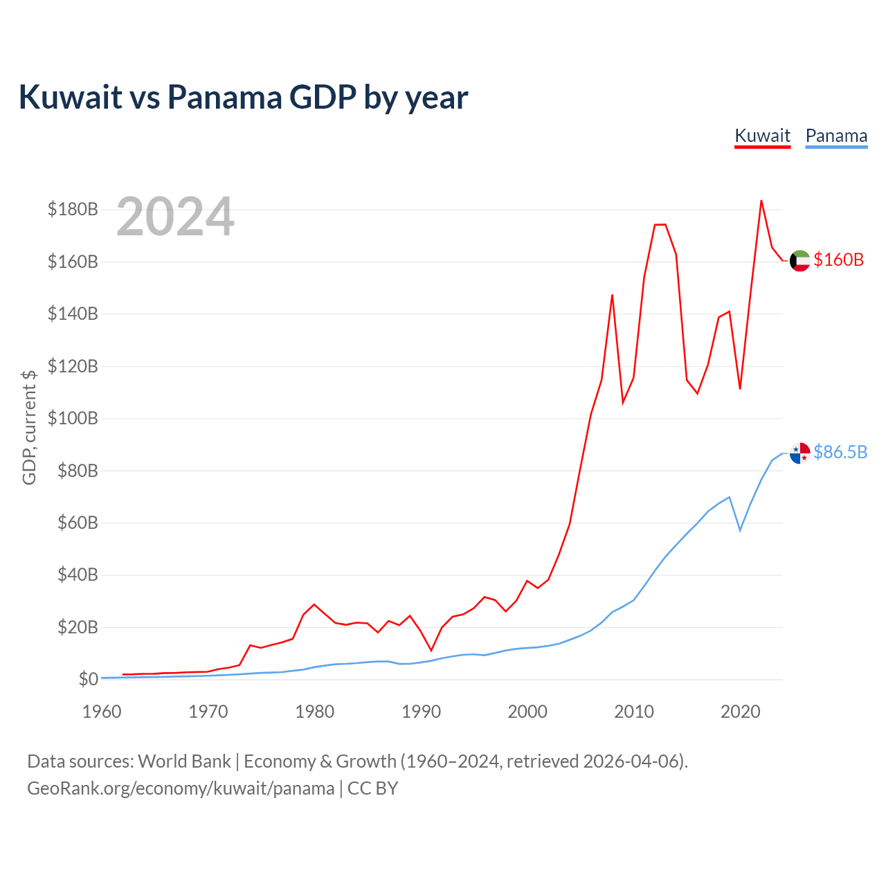 Kuwait has a GDP of $160B compared to $86.5B for Panama, ranking 59/197 and 78/197 by economy size, respectively.