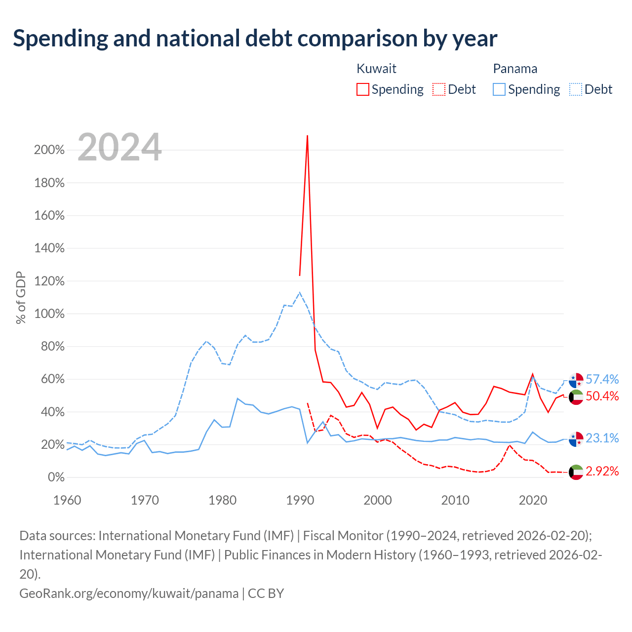 Kuwait has $4.68B in government debt (2.92% of GDP), compared to $49.6B (57.4% of GDP) in Panama.
