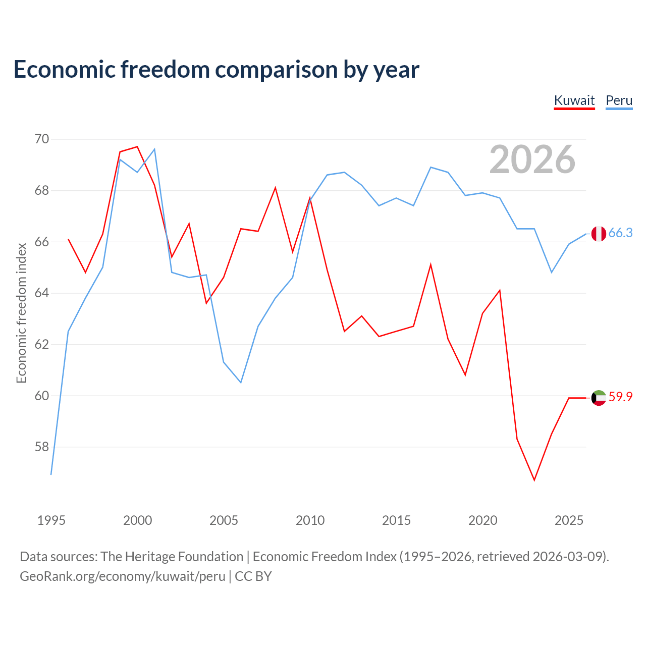 The Economic Freedom Index for Kuwait is 59.9, ranking 100/197, compared to 66.3 for Peru, ranking 62/197. The chart above displays a comparison of annual changes in economic freedom indexes.