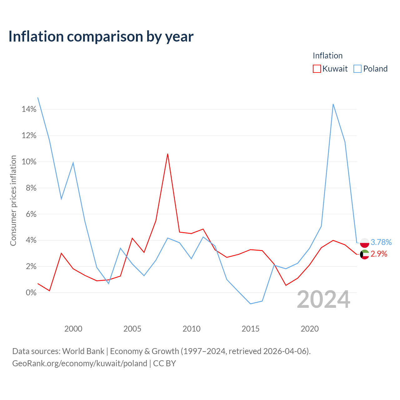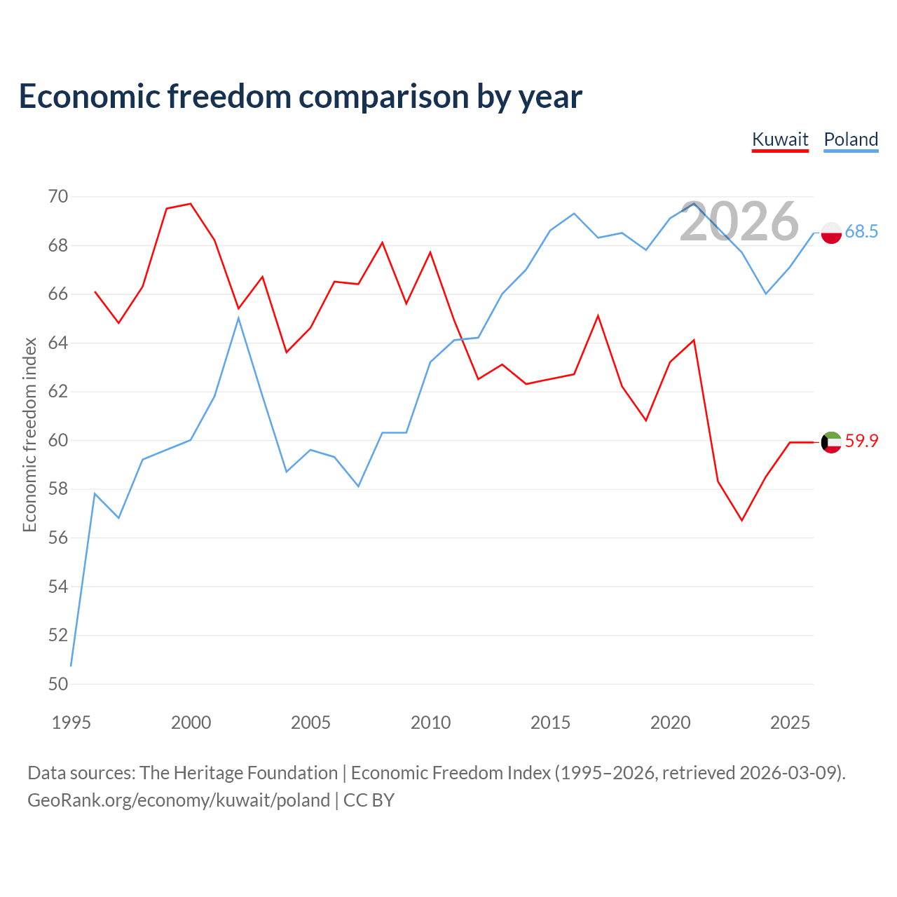 The Economic Freedom Index for Kuwait is 59.9, ranking 100/197, compared to 68.5 for Poland, ranking 46/197. The chart above displays a comparison of annual changes in economic freedom indexes.
