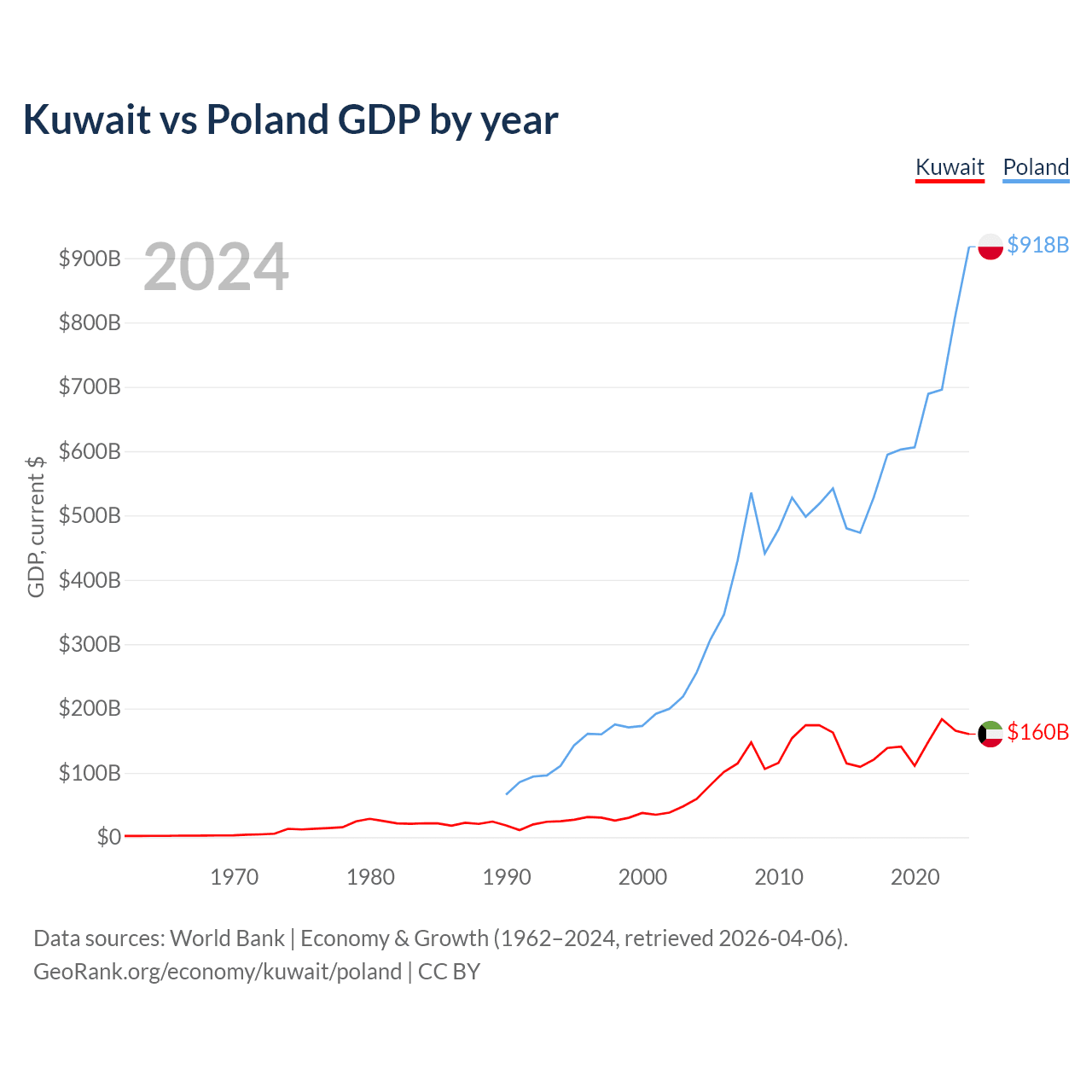 Kuwait has a GDP of $160B compared to $918B for Poland, ranking 59/197 and 21/197 by economy size, respectively.