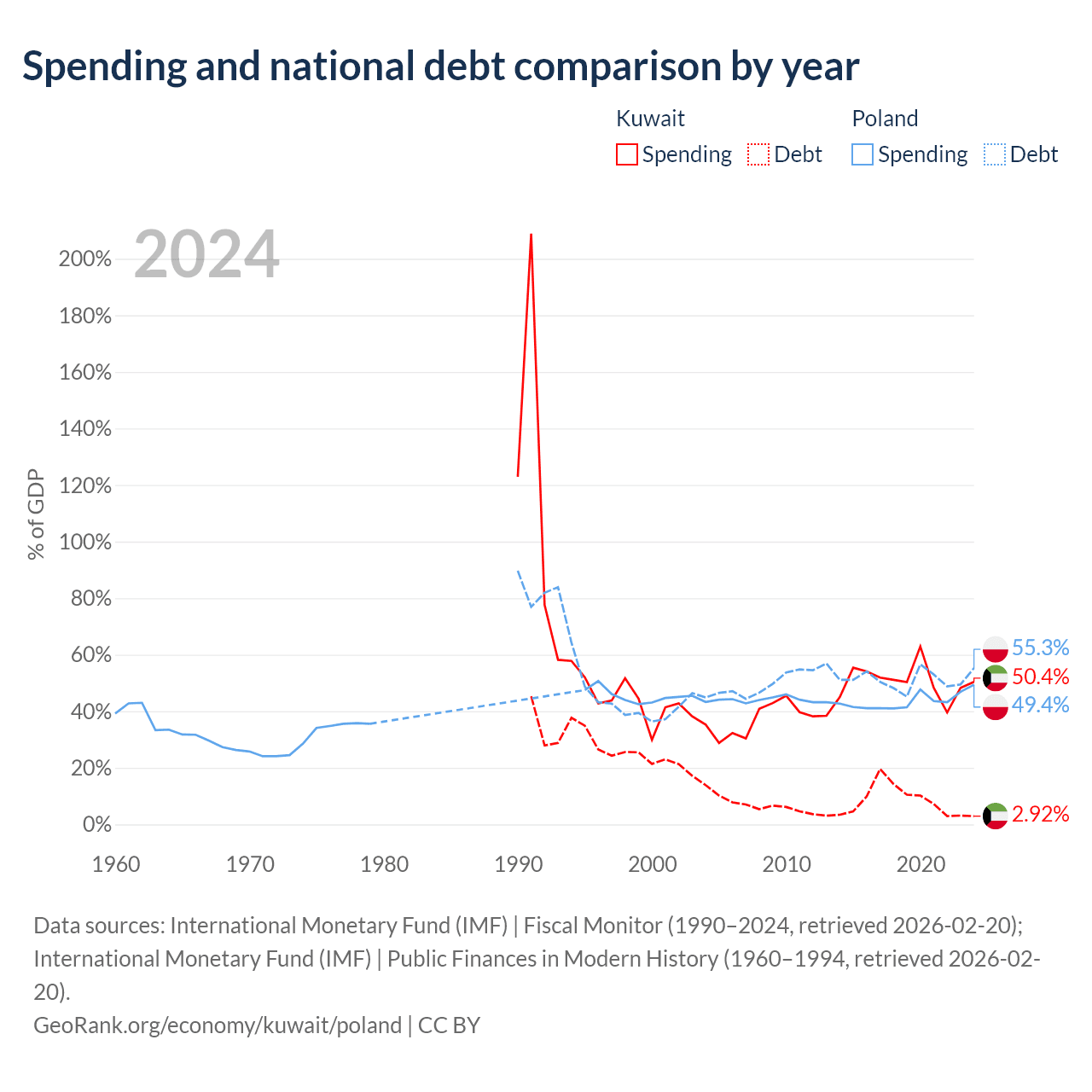 Kuwait has $4.68B in government debt (2.92% of GDP), compared to $507B (55.3% of GDP) in Poland.
