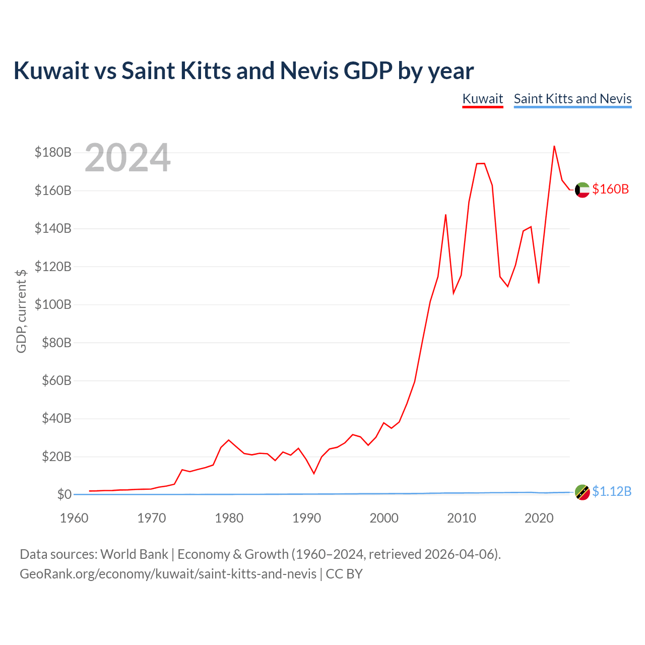 Kuwait has a GDP of $160B compared to $1.12B for Saint Kitts and Nevis, ranking 59/197 and 187/197 by economy size, respectively.