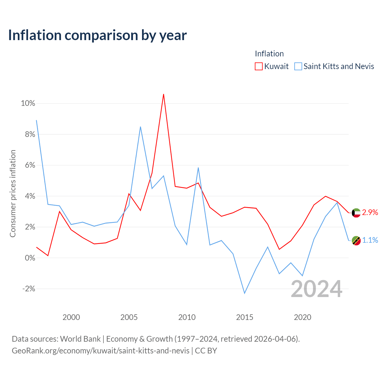 Over the past 28 years, Kuwait has recorded an average annual inflation rate of 2.94%, compared with 2.25% in Saint Kitts and Nevis. In 2024, inflation was 2.9% in Kuwait and 1.1% in Saint Kitts and Nevis.