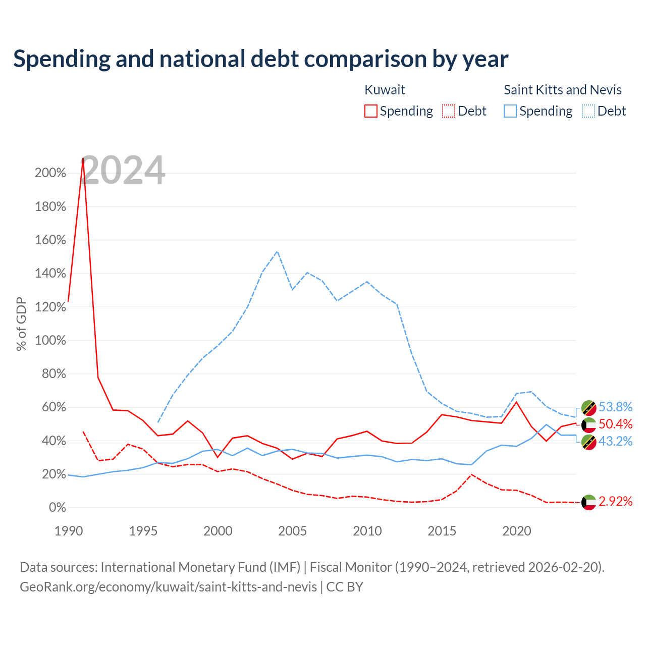 Kuwait has $4.68B in government debt (2.92% of GDP), compared to $604M (53.8% of GDP) in Saint Kitts and Nevis.