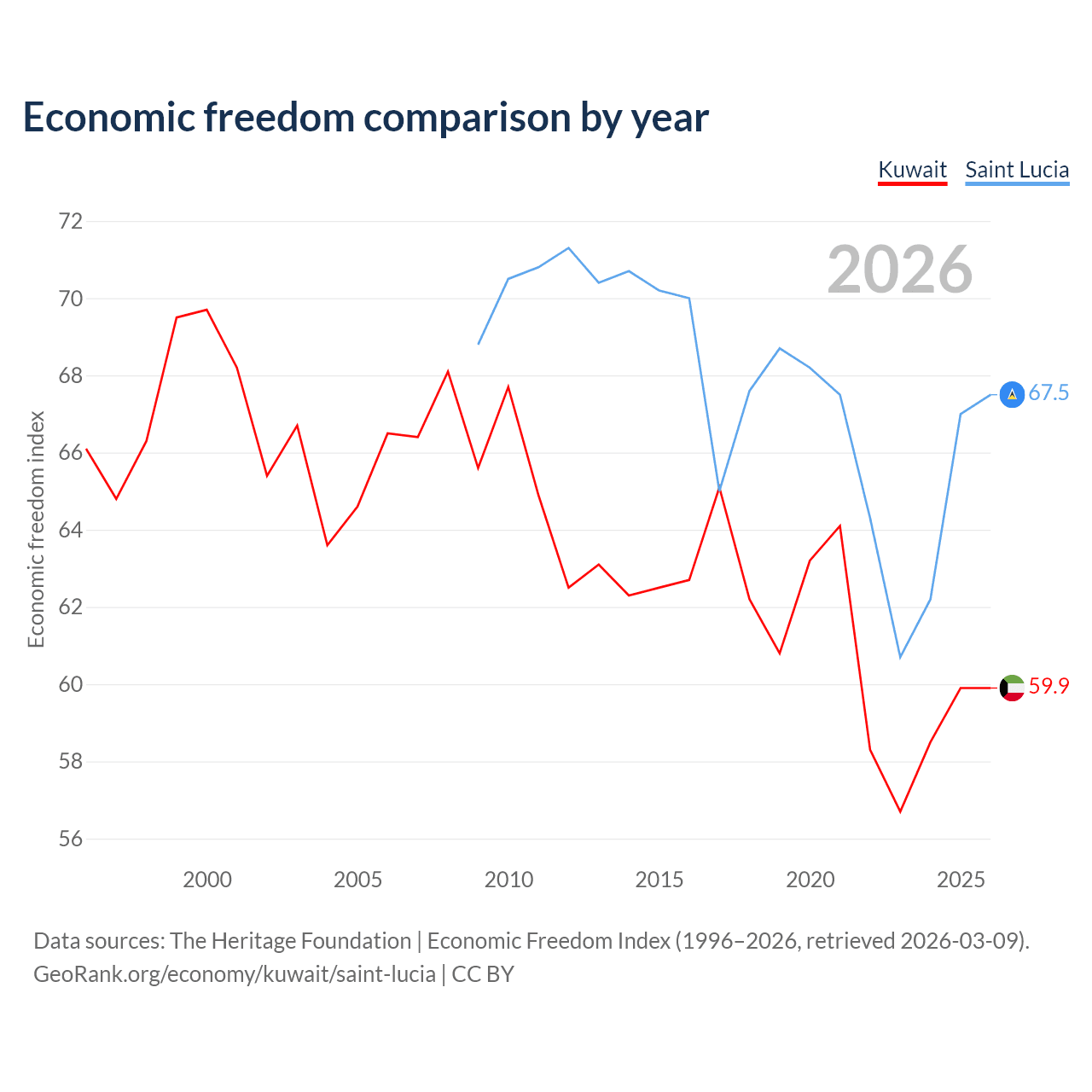The Economic Freedom Index for Kuwait is 59.9, ranking 100/197, compared to 67.5 for Saint Lucia, ranking 57/197. The chart above displays a comparison of annual changes in economic freedom indexes.