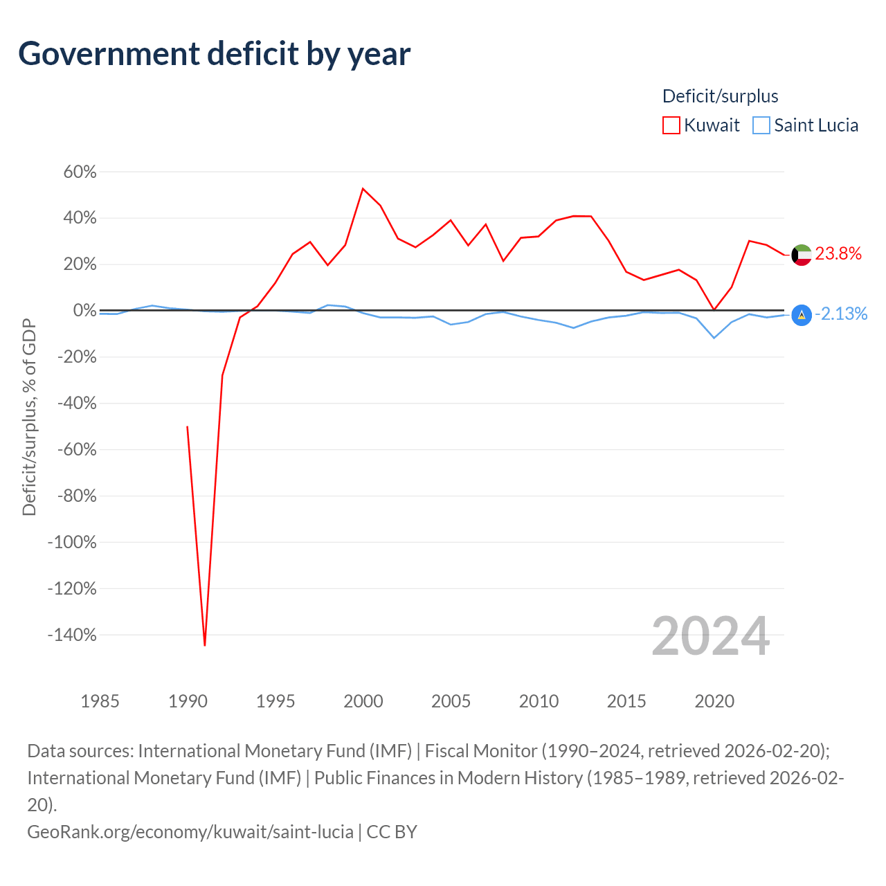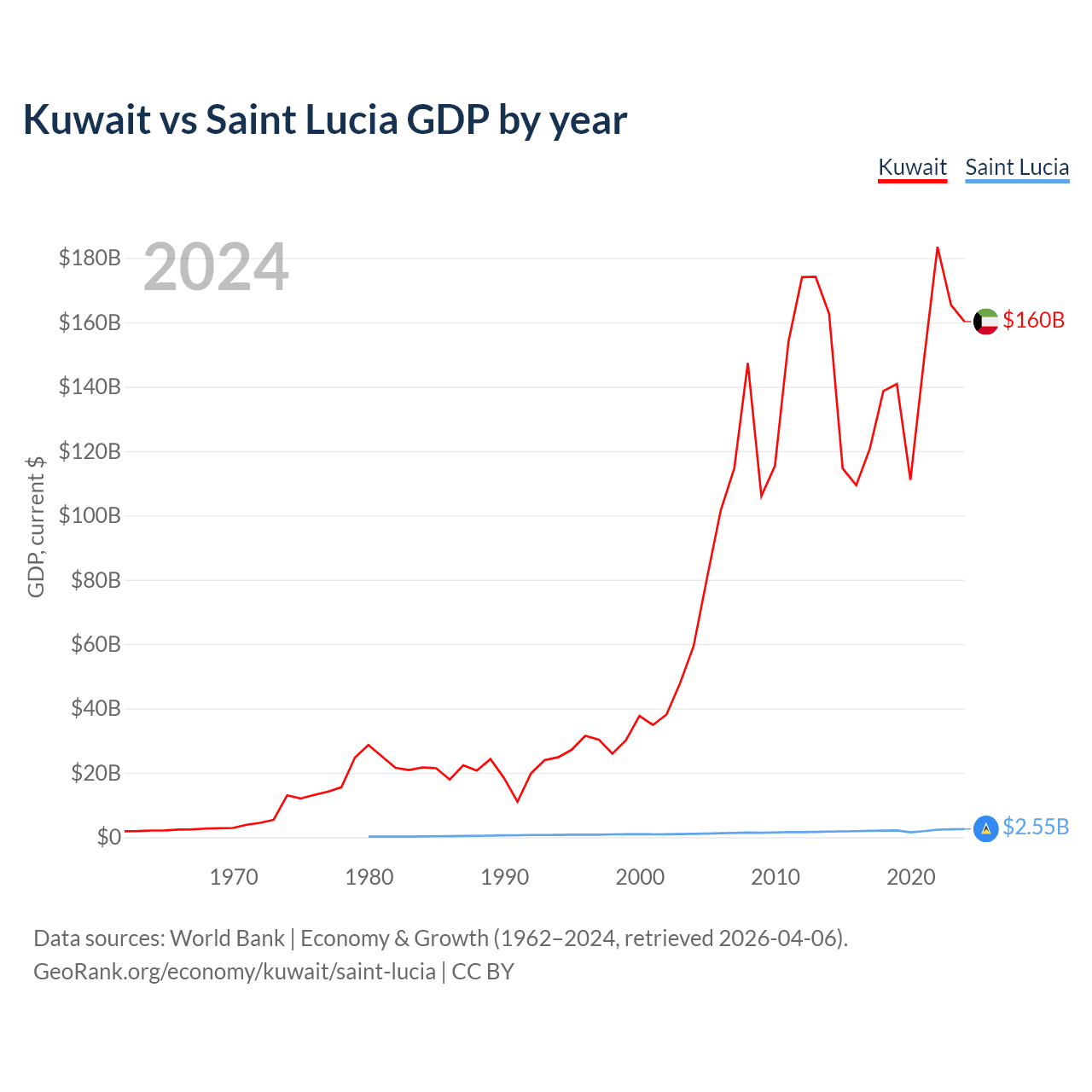 Kuwait has a GDP of $160B compared to $2.55B for Saint Lucia, ranking 59/197 and 173/197 by economy size, respectively.