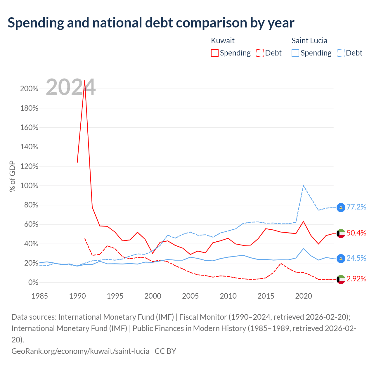 Kuwait has $4.68B in government debt (2.92% of GDP), compared to $1.97B (77.2% of GDP) in Saint Lucia.
