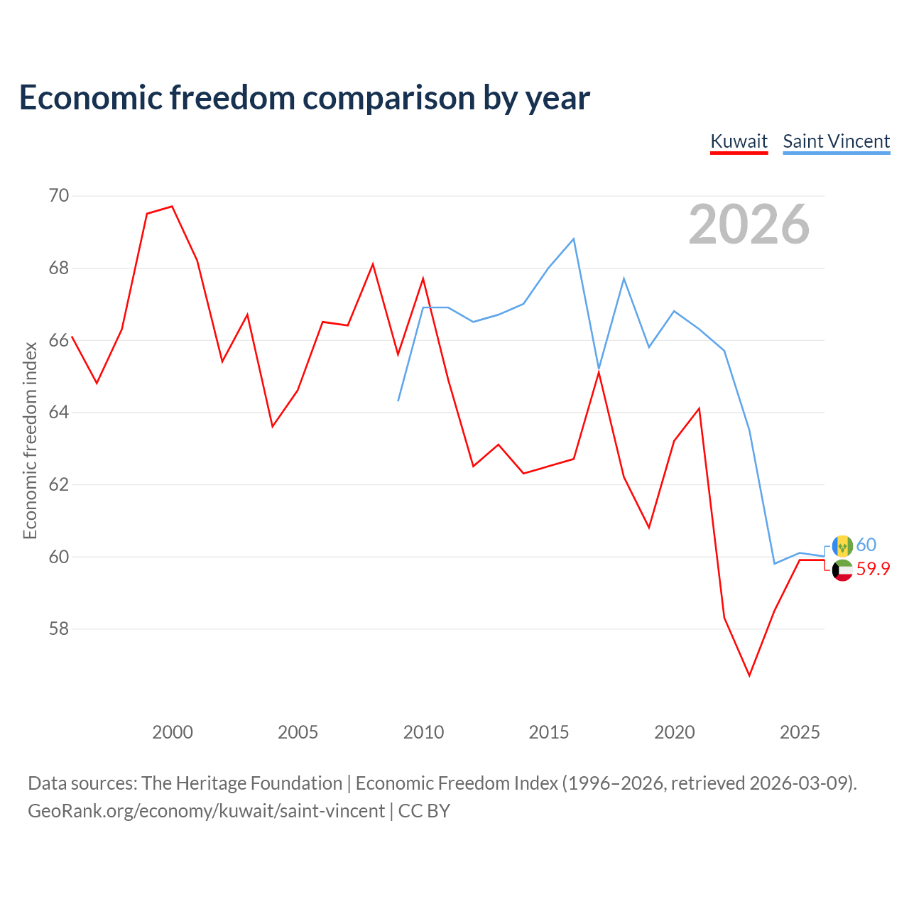 The Economic Freedom Index for Kuwait is 59.9, ranking 100/197, compared to 60 for Saint Vincent, ranking 98/197. The chart above displays a comparison of annual changes in economic freedom indexes.