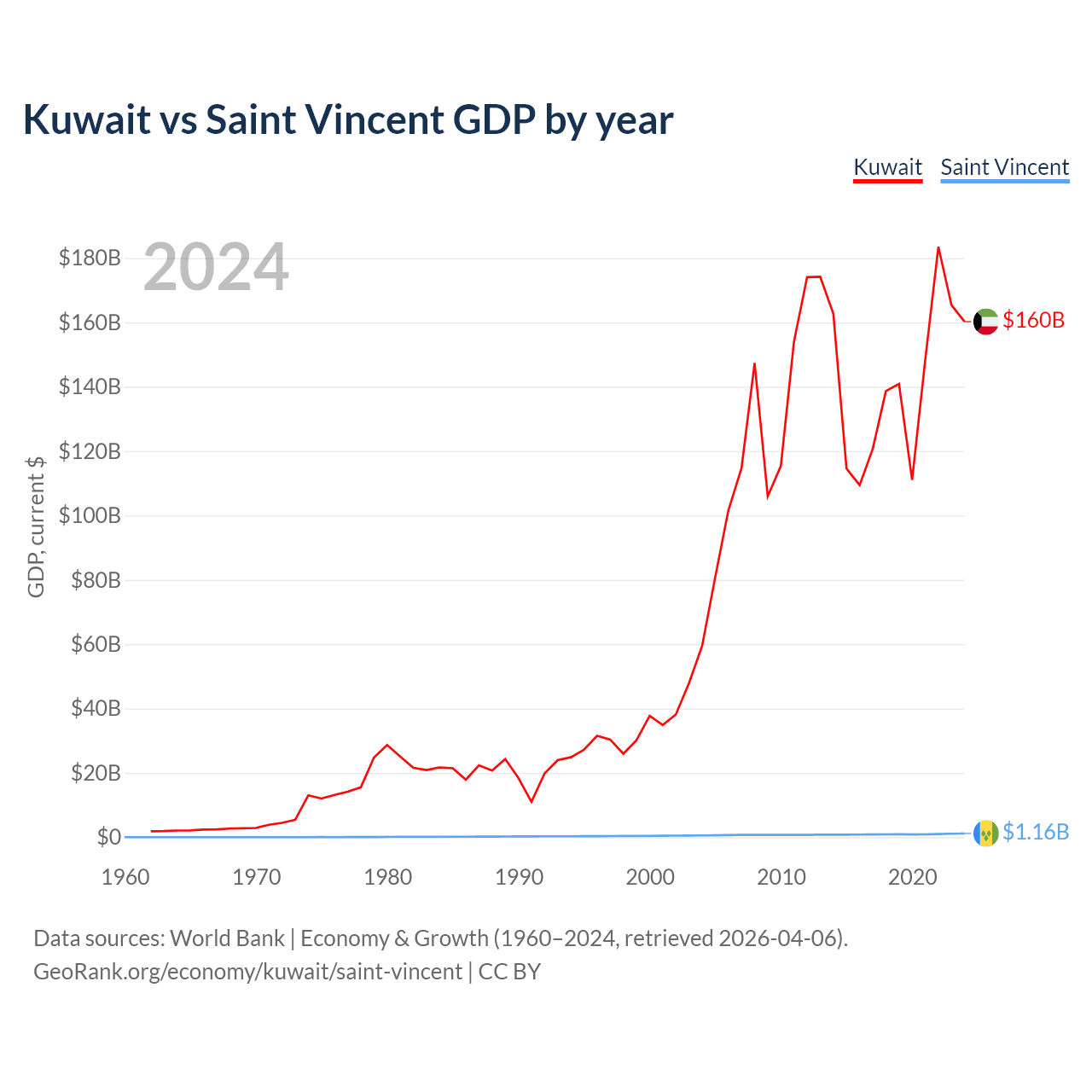 Kuwait has a GDP of $160B compared to $1.16B for Saint Vincent, ranking 59/197 and 186/197 by economy size, respectively.