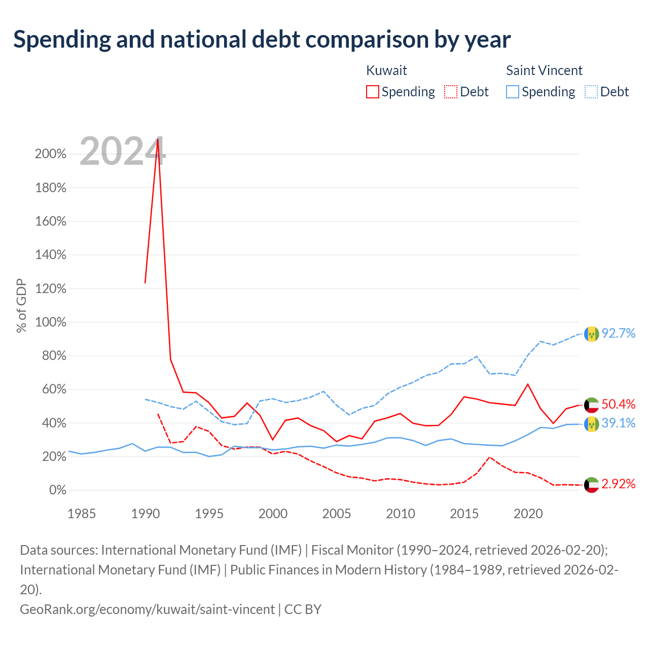 Kuwait has $4.68B in government debt (2.92% of GDP), compared to $1.07B (92.7% of GDP) in Saint Vincent.