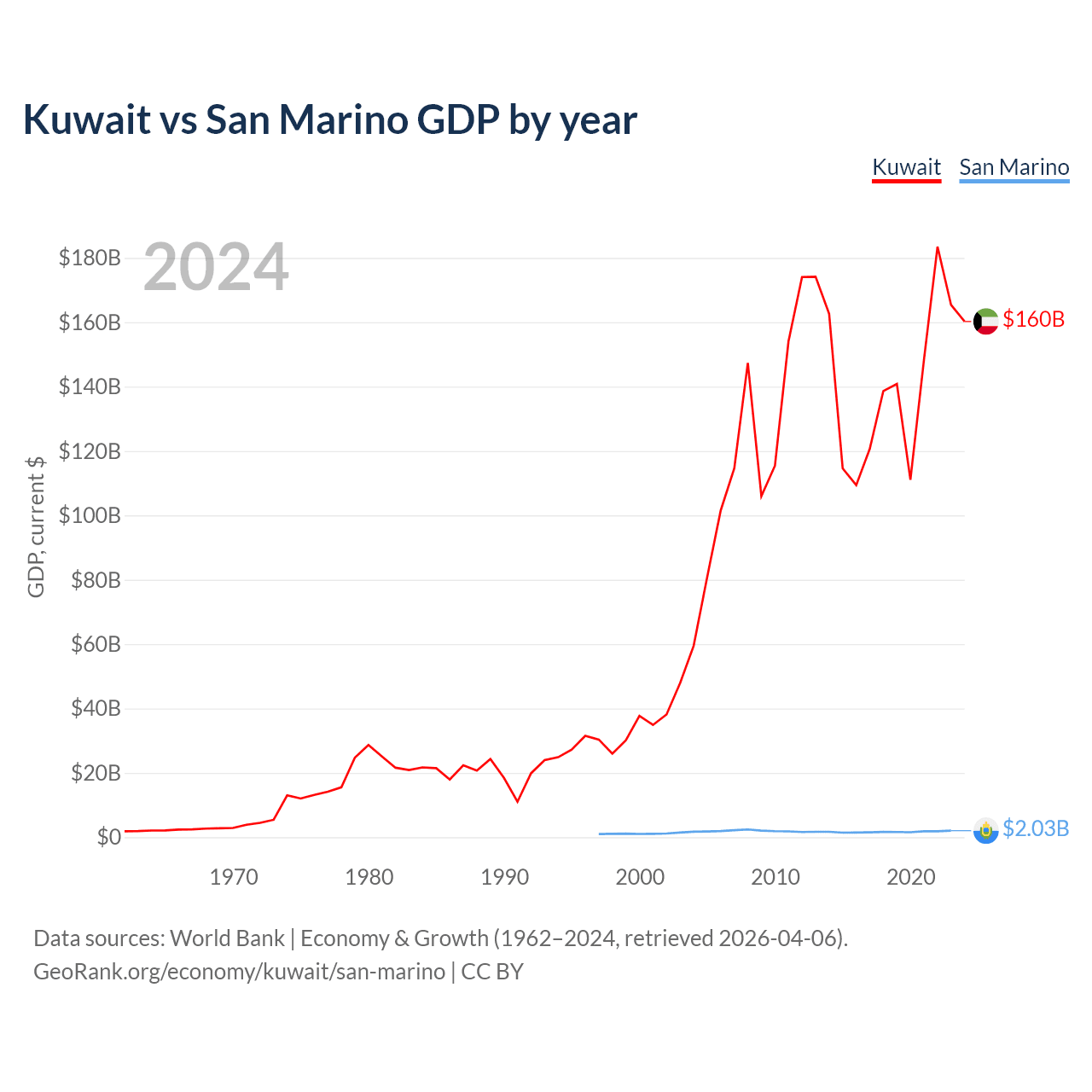 Kuwait has a GDP of $160B compared to $2.03B for San Marino, ranking 59/197 and 180/197 by economy size, respectively.
