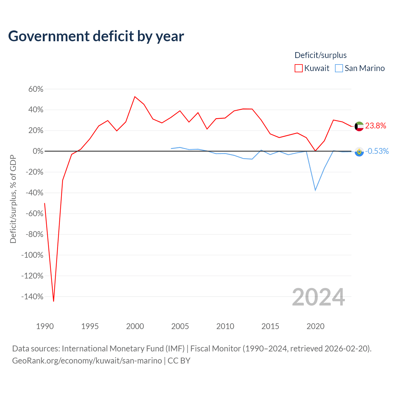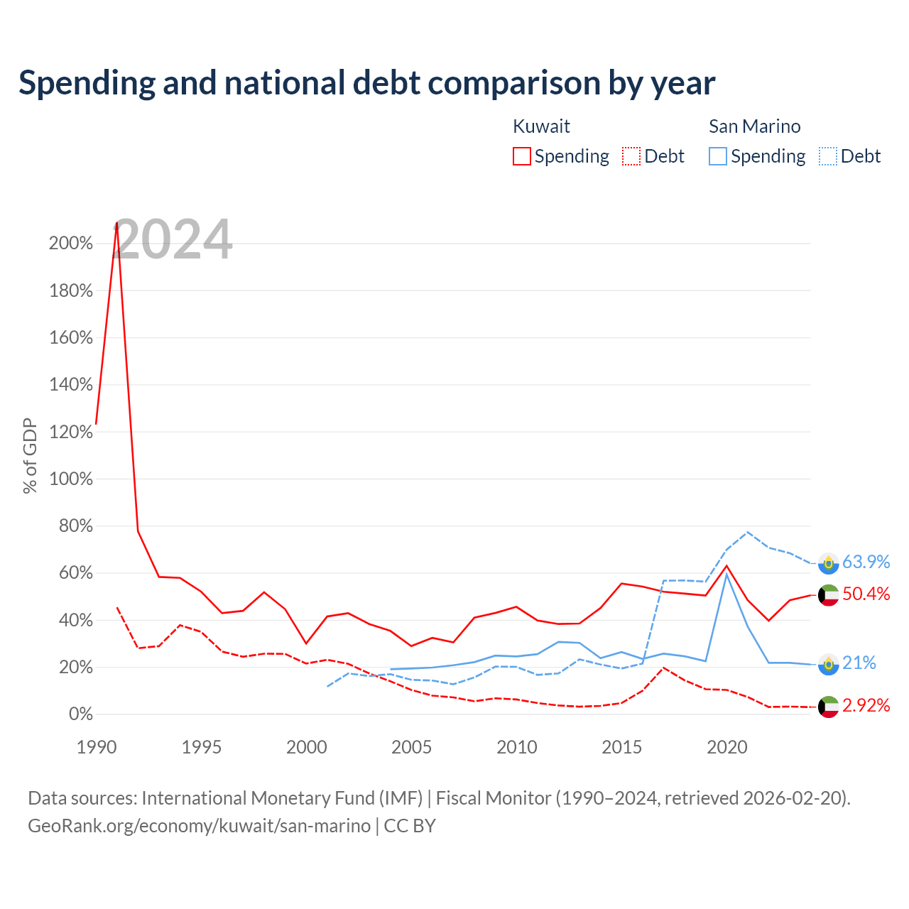 Kuwait has $4.68B in government debt (2.92% of GDP), compared to $1.39B (63.9% of GDP) in San Marino.