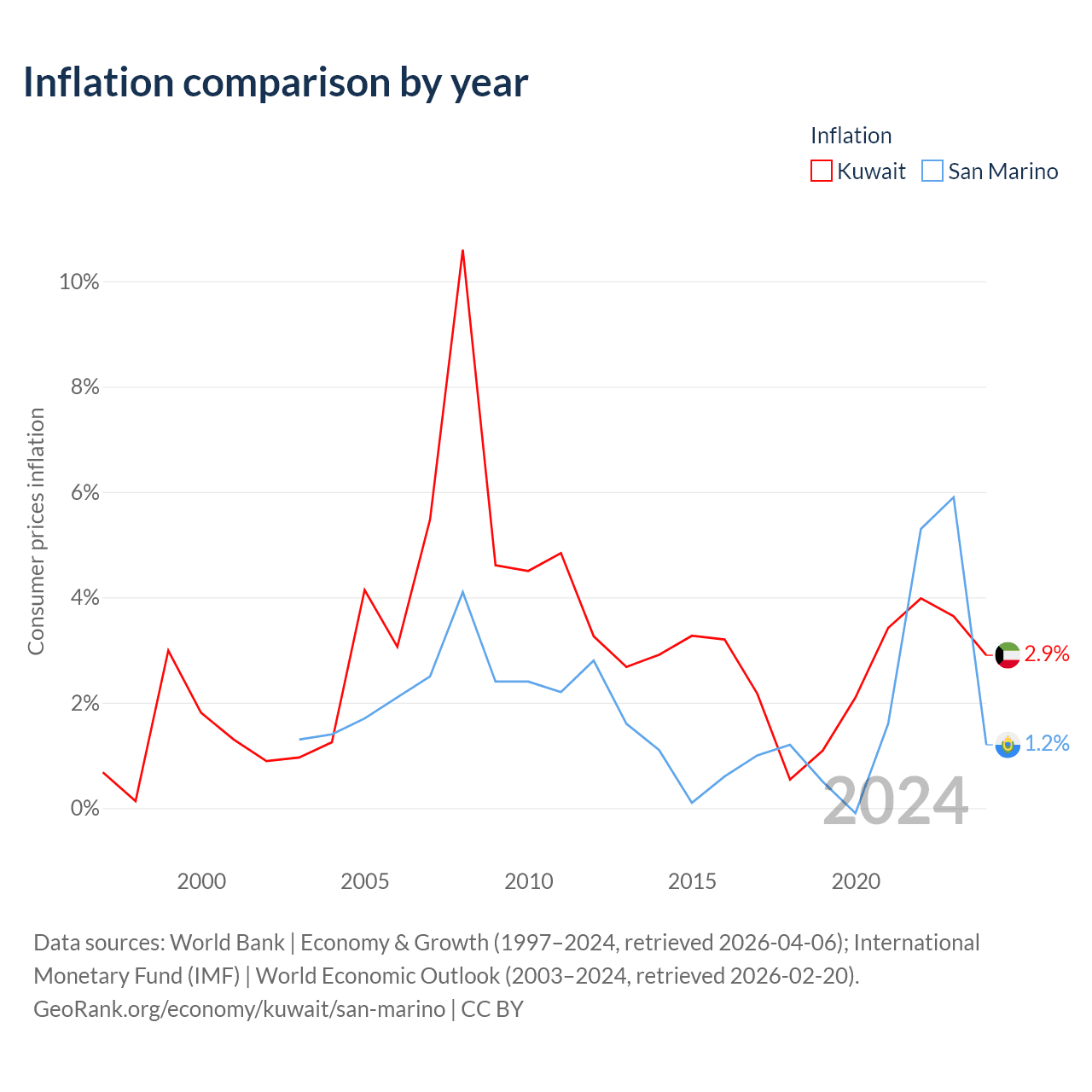 Over the past 22 years, Kuwait has recorded an average annual inflation rate of 3.39%, compared with 1.95% in San Marino. In 2024, inflation was 2.9% in Kuwait and 1.2% in San Marino.