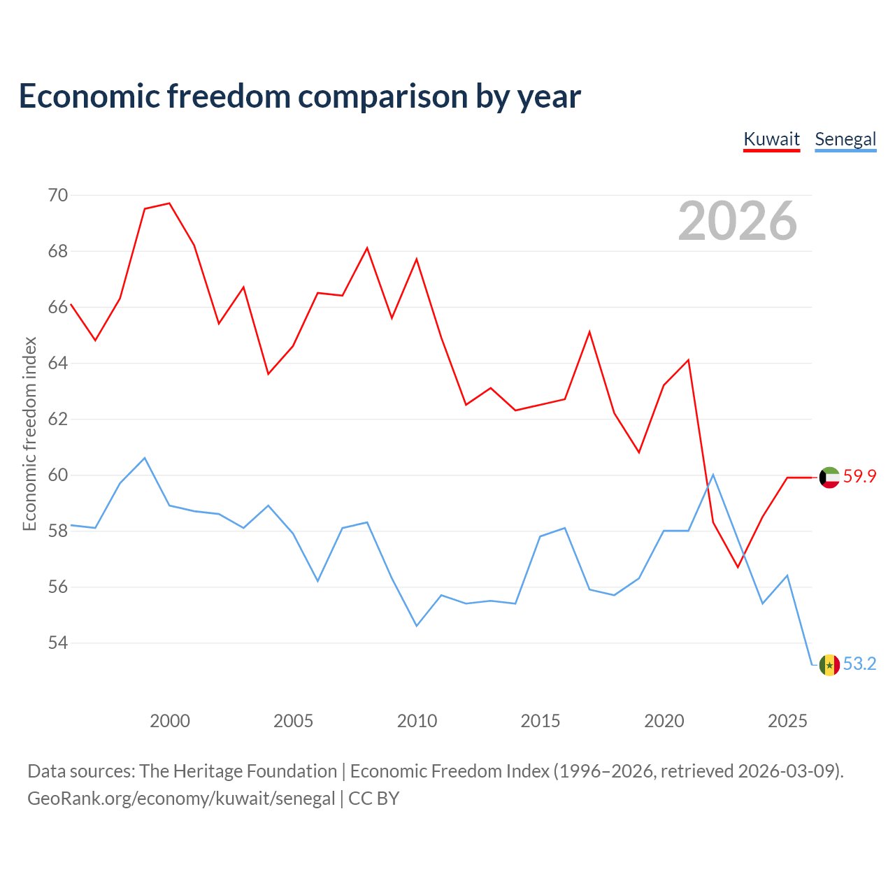 The Economic Freedom Index for Kuwait is 59.9, ranking 100/197, compared to 53.2 for Senegal, ranking 140/197. The chart above displays a comparison of annual changes in economic freedom indexes.
