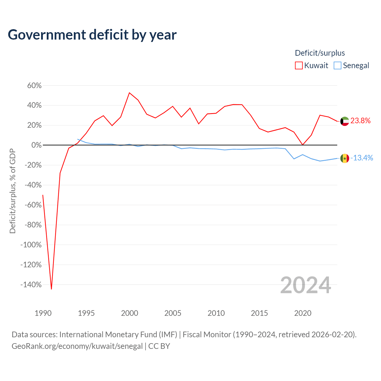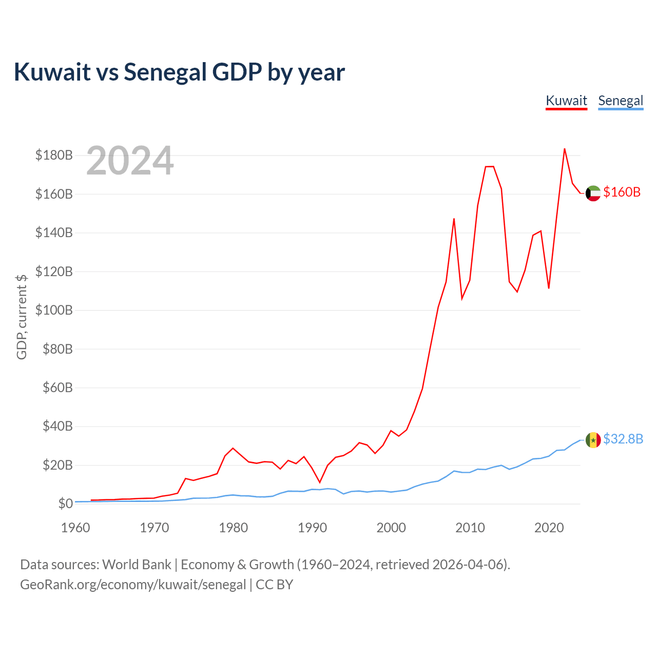 Kuwait has a GDP of $160B compared to $32.8B for Senegal, ranking 59/197 and 109/197 by economy size, respectively.