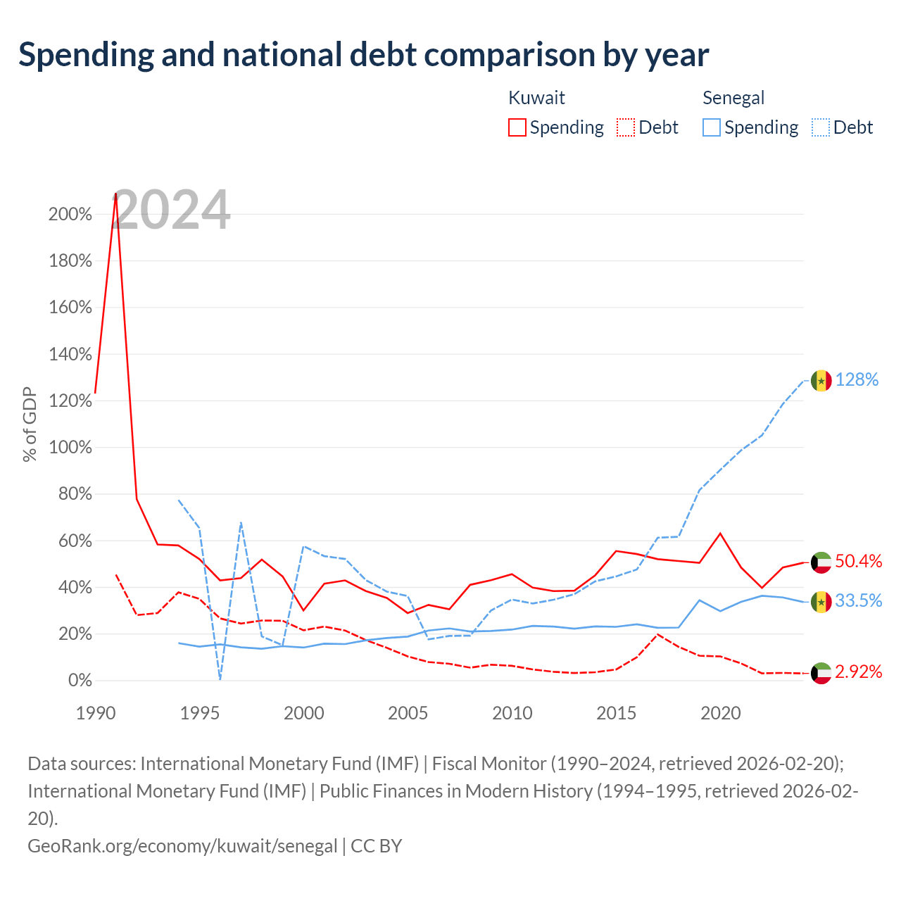 Kuwait has $4.68B in government debt (2.92% of GDP), compared to $42.1B (128.4% of GDP) in Senegal.