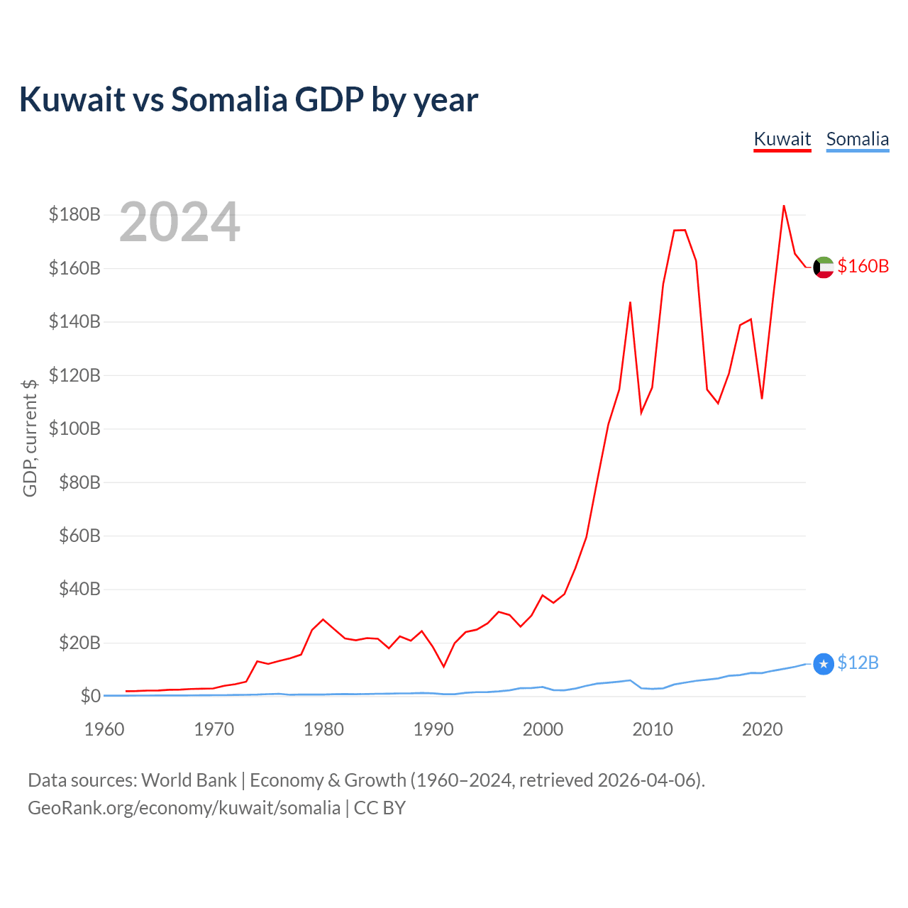 Kuwait has a GDP of $160B compared to $12B for Somalia, ranking 59/197 and 150/197 by economy size, respectively.