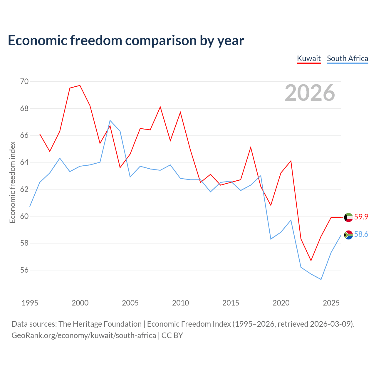 The Economic Freedom Index for Kuwait is 59.9, ranking 100/197, compared to 58.6 for South Africa, ranking 110/197. The chart above displays a comparison of annual changes in economic freedom indexes.