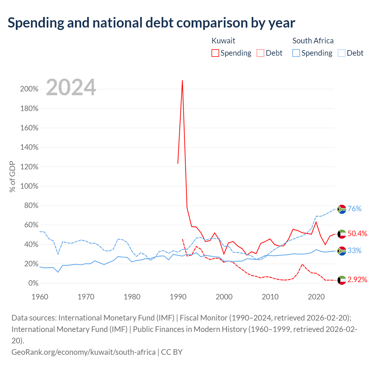 Kuwait has $4.68B in government debt (2.92% of GDP), compared to $305B (76% of GDP) in South Africa.