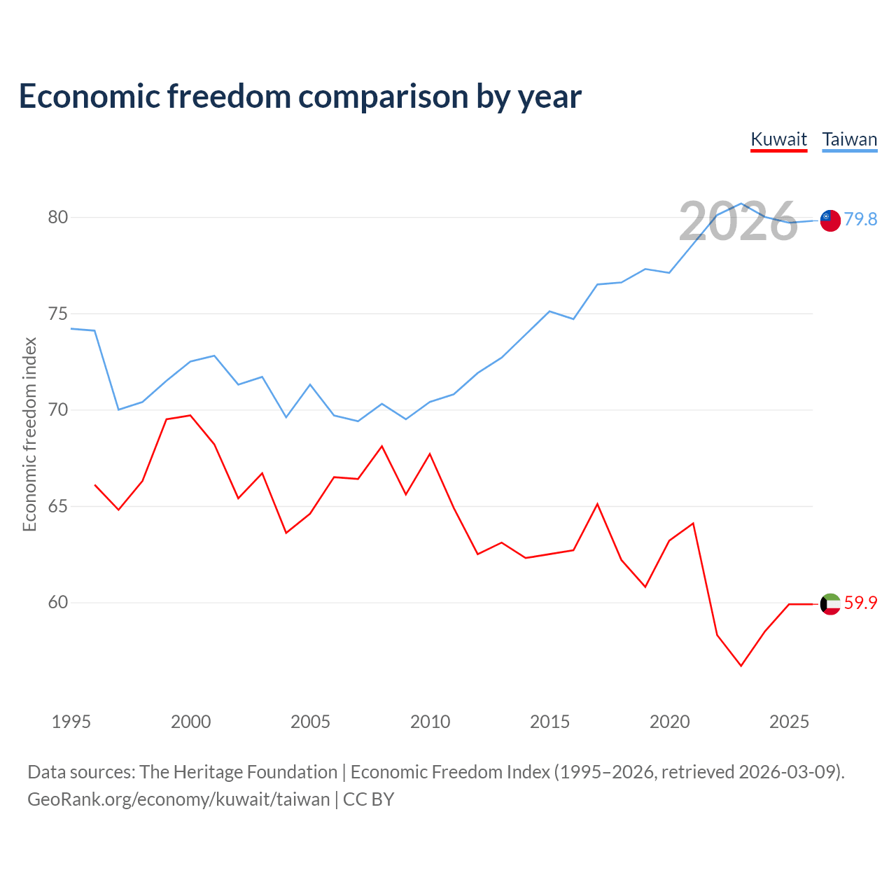 The Economic Freedom Index for Kuwait is 59.9, ranking 100/197, compared to 79.8 for Taiwan, ranking 6/197. The chart above displays a comparison of annual changes in economic freedom indexes.