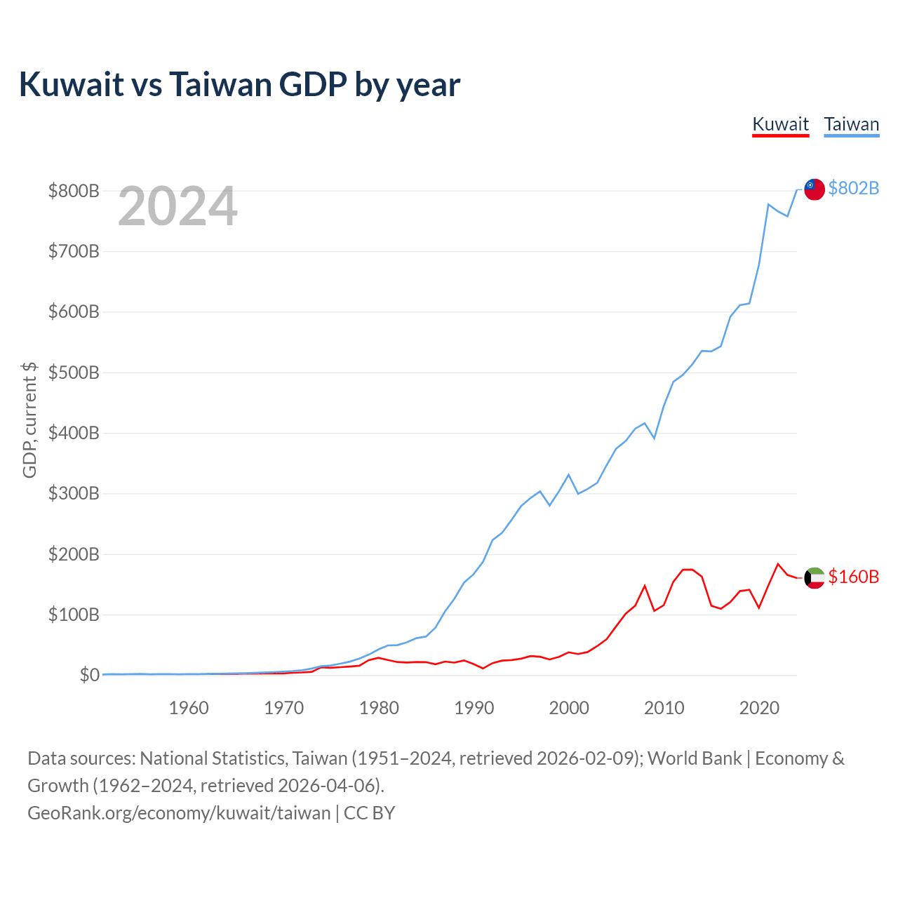 Data sources: National Statistics, Taiwan (1951–2024, retrieved 2026-02-09); World Bank | Economy & Growth (1962–2024, retrieved 2026-04-06).